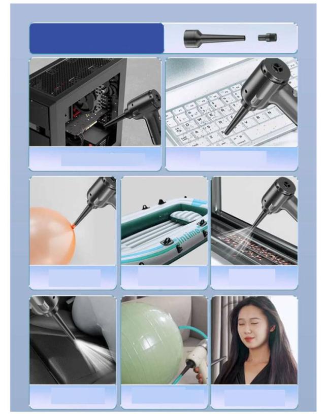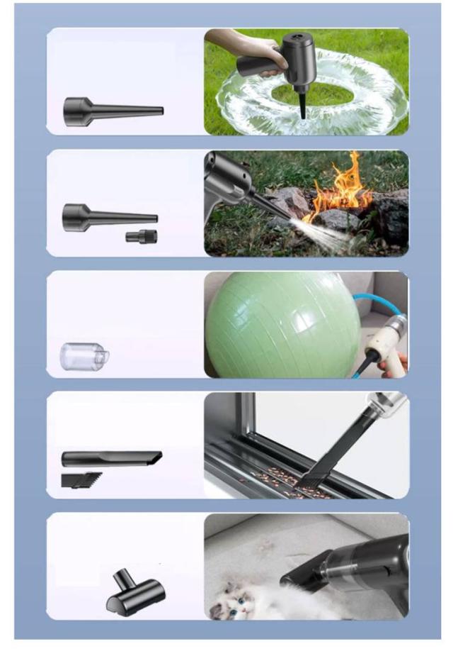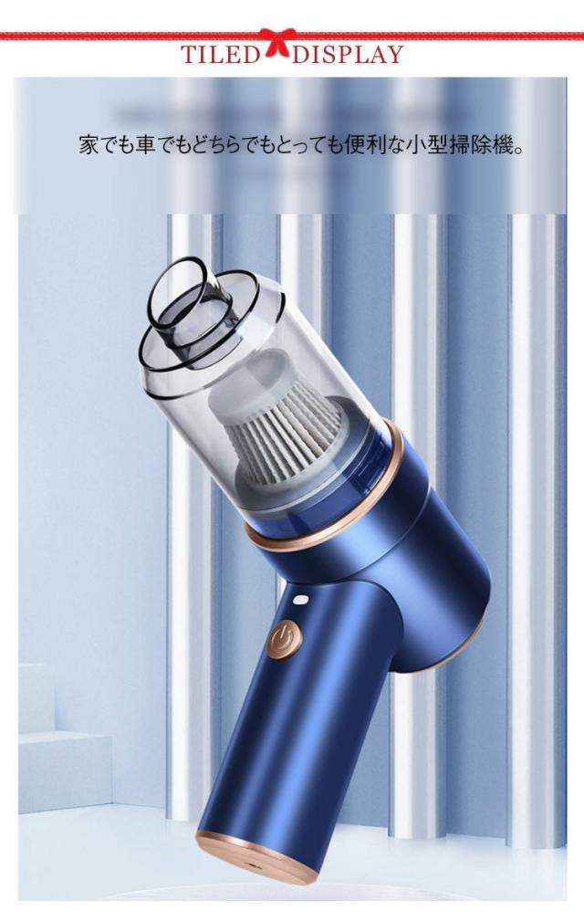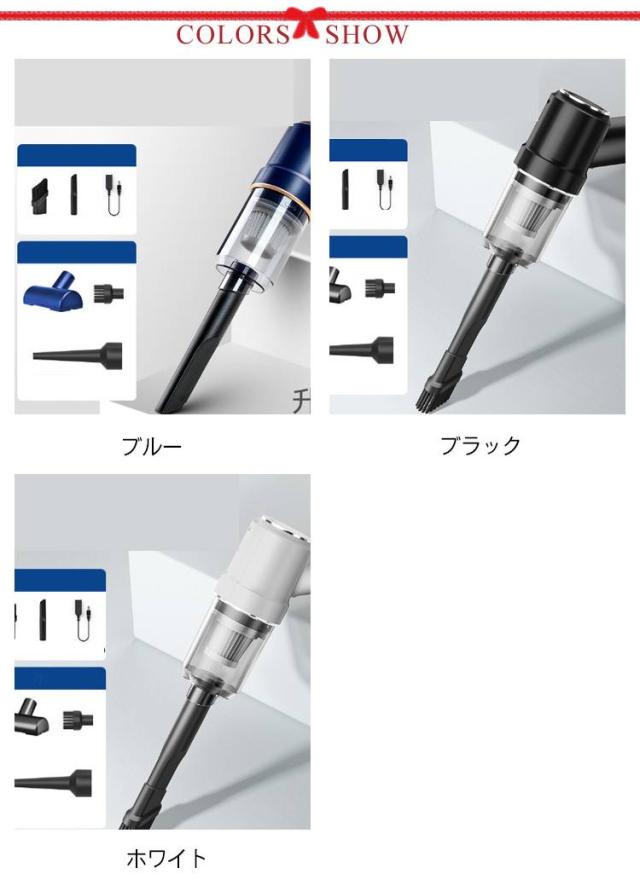 | 家でも車でもどちらでもとっても便利な小型掃除機。 【使用説明】: 1.充電が十分であるか確認してください。 2.スイッチをオンにすれば使用できます。 3.使用場所に応じて、異なる吸引ノズルに交換してください。 4.本製品は乾湿両用掃除機です。水を吸引する際は、前面カバーを開けて排水を行ってください。 5.充電中はUSBインジケーターが赤色で表示され、緑色で充電完了を示します。 6.充電時間は約3〜4時間で、充電完了後は約30分の使用が可能です。 【注意事項】: 1.使用時はフィルターを必ず取り付けてください。 2直射日光を避け、高温・高圧の場所での使用を避けてください。 3.ガソリンや揮発性の強い洗浄剤で機器を拭かないでください。 4.モーターが回転している時に前カバーを取り外さないでください。 5.本製品は車用の道具ですので、子供が単独で使用しないようにしてください。 6.湿った物を吸引する際は、前カバー内の水位に注意してください。 7.隙間のゴミを取り除く際は、ガチョウ嘴ノズルを取り付けてください。 8.通常状態で使用すると、約30分間使用可能で、車のバッテリーには影響を与えません。 9.使用後はスイッチをオフにし、集塵容器からゴミを取り除く際は、固定ボタンを押してからゴミを捨ててください。 | |