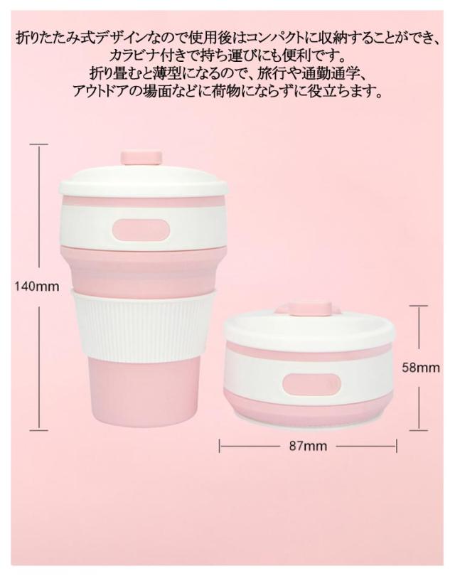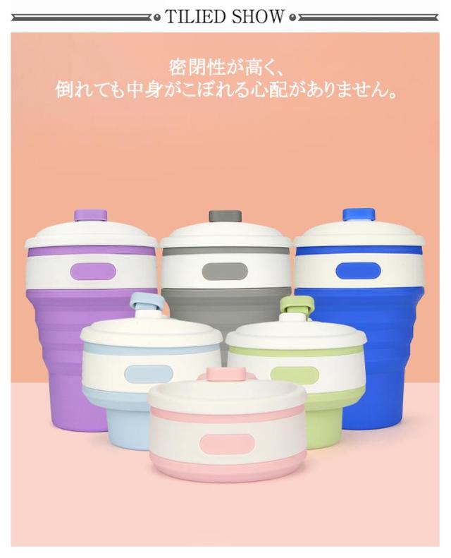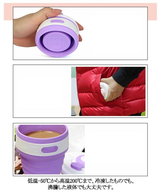 | シリコン製で柔らかく軽くて持ちやすい、断熱性がある丈夫なコップです。 密閉性が高く、倒れても中身がこぼれる心配がありません。 食品用のシリコン素材でつくられているので、無味無臭で衛生的にも安心して使用ができます。 折りたたみ式デザインなので使用後はコンパクトに収納することができ、カラビナ付きで持ち運びにも便利です。 折り畳むと薄型になるので、旅行や通勤通学、アウトドアの場面などに荷物にならずに役立ちます。 本体にはカップスリーブがついており、滑り止めデザインがされているので持ちやすく飲みやすいです。 飲み口には細いストロー(直径3mm以内)であれば差し込むこともできるので、直接飲みとストロー飲みと2wayで使用できます。 シリコン製だから洗うときの傷がつきにくく、茶渋などの汚れも残りにくいので清潔にご使用いただけます。 低温-50℃から高温200℃まで、冷凍したものでも、沸騰した液体でも大丈夫です。 | |