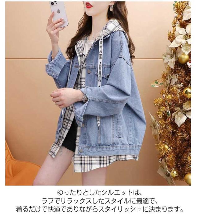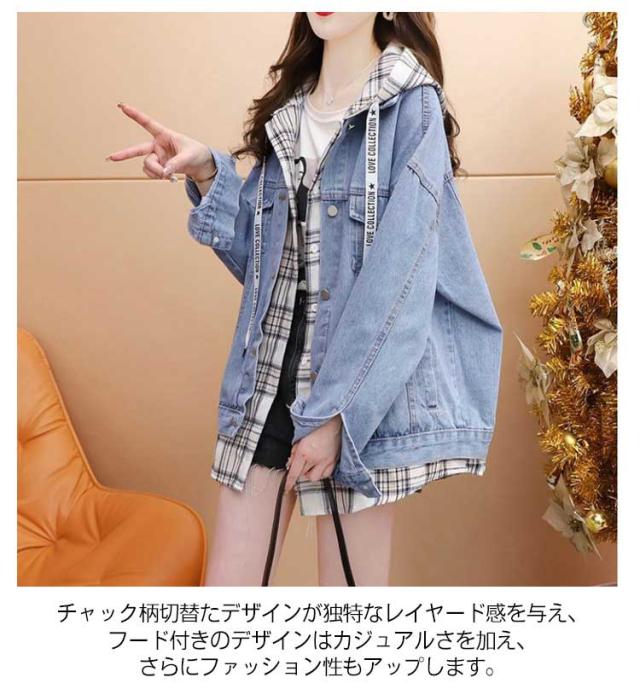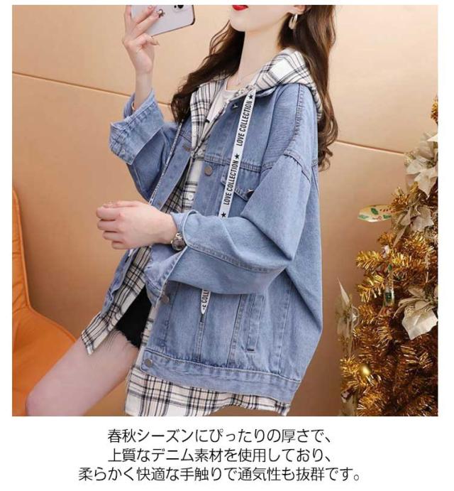 デニムジャケット ジャケット フード付き トップス 通学 Gジャン チェック柄 羽織り ジージャン ライトアウター 切り替え 長袖 デニム 春服 レディース 通勤 春秋 おしゃれ カジュアル ゆったり 体型カバー 20代 30代 40代