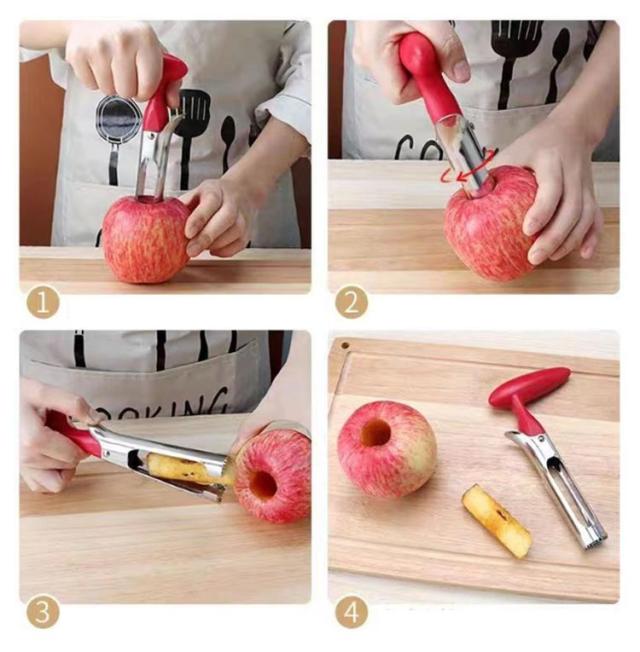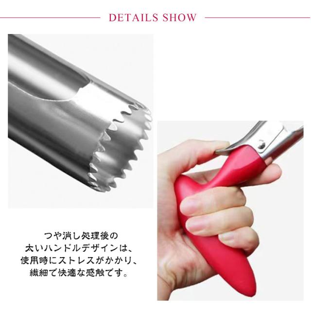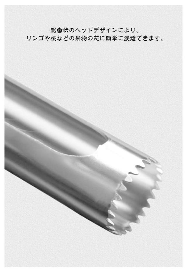 | リンゴの芯をラクラク簡単にスッポ抜き! 刃先をさして回すだけで、簡単にりんごの芯を取ることができます。 鋸歯状のヘッドデザインにより、リンゴや桃などの果物の芯に簡単に浸透できます。 つや消し処理後の太いハンドルデザインは、使用時にストレスがかかり、繊細で快適な感触です。 フルーツコアはコアリムーバーヘッドから簡単に取り出せるので、時間を大幅に節約できます。 | |