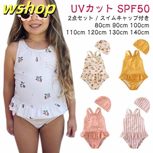 水着 キッズ 女の子 一体型 スイムキャップ付き スイムウェア こども キッズ ラッシュガード 日焼け防止 UVカット SPF50 紫外線防止 幼児 幼稚園 小学生 80cm 90cm 100cm 110cm 120cm 130cm 140cm 可愛い 海 夏休み プール 砂遊び アウトドア おうちプール フリル swimwear