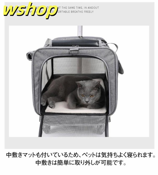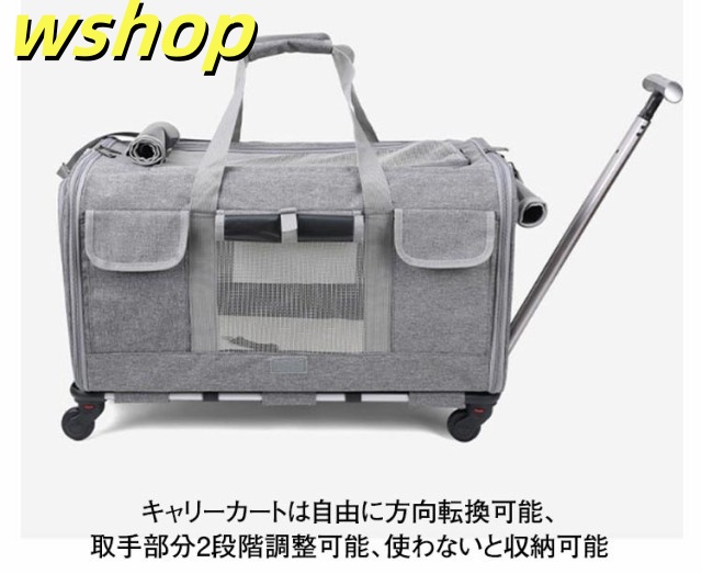 | いろんなシーンで大活躍!お出かけや旅行はもちろん病院などさまざまな場所で使えるペットキャリー 4か所の窓は二重構造となっており、内側はメッシュ素材で通気性も抜群です。 中敷きマットも付いているため、ペットは気持ちよく寝られます。中敷きは簡単に取り外しが可能です。 キャリーカートは自由に方向転換可能、取手部分2段階調整可能、使わないと収納可能 折りたたむとコンパクトで収納に場所を取りません。 キャスターは押し込むだけで設置可能です、道具いらず取り外すも簡単! | |