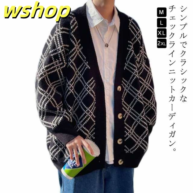 【wshop 】ニット カーディガン チェック柄 総柄 メンズ 秋 冬 厚手 ニットカーディガン Vネック アーガイル柄 ニット カーデ 羽織り アウター オーバーサイズ ルーズ 秋物 秋服 韓国風 ストリート カジュアル おしゃれ シンプル 大きいサイズ ブラック 黒