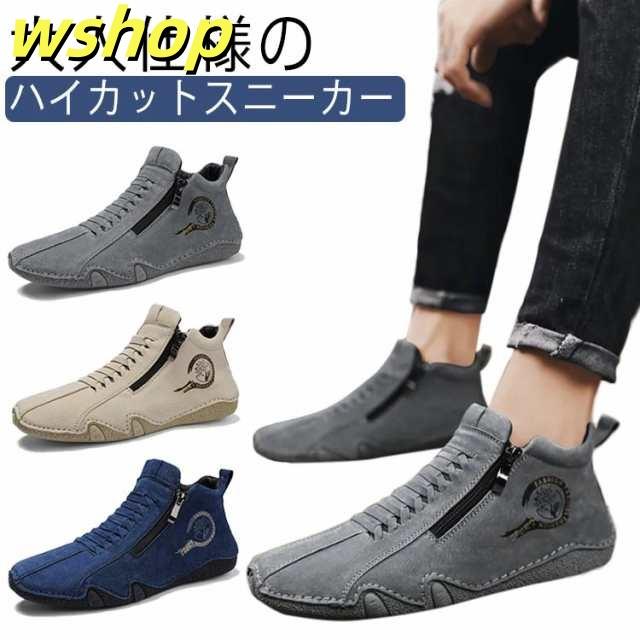 スニーカー メンズ カジュアルシューズ ハイカット 裏ボア 裏起毛 革靴 ドライビングシューズ ジッパー ファスナー スポーティ アウトドア 歩きやすい 疲れにくい レザー 軽量