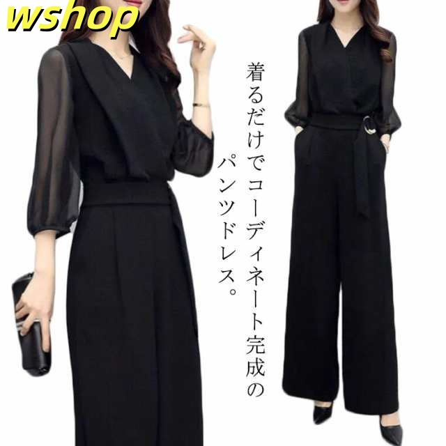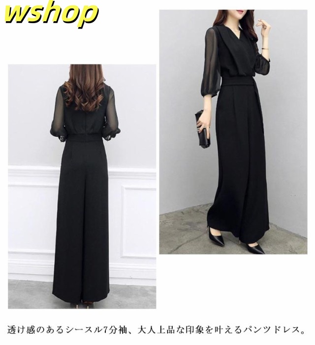 コーデ 7分袖 パンツドレス レディース サロペット ママ 結婚式 パーティードレス 透け感 送料無料 オールインワン 着痩せ パンツスーツ 40代 二次会 演奏会 お呼ばれ きれいめ 50代 春 披露宴 フォーマル 黒 20代