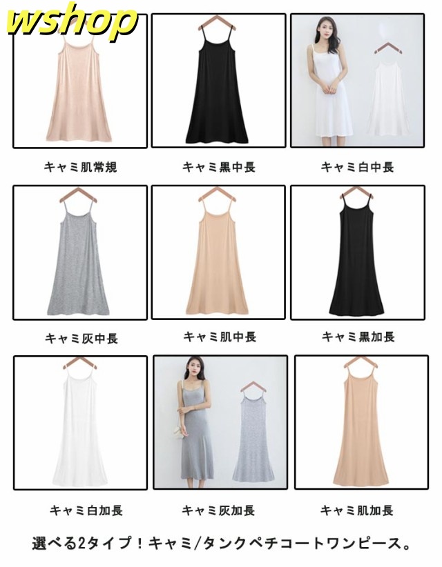 | 選べる2タイプ!キャミ/タンクペチコートワンピース。 透け感が気になるワンピやチュニックのインナーに重宝するペチワンピース。 身長や、合わせるワンピースの着丈によって長さを選べます。 1日中快適に着られるサラサラ素材。やわらかく快適な着心地。ルームウェアにもぴったり♪ シーズンレスで活躍する優秀インナーは持っていて間違いなし! | |