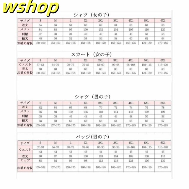 | サイズについての説明 | 4点セット内容:ジャケット、スカート(女の子)/バッジ(男の子)、シャツ、ネクタイ(男の子)/リボン(女の子)サイズ表は画像をご参照ください |