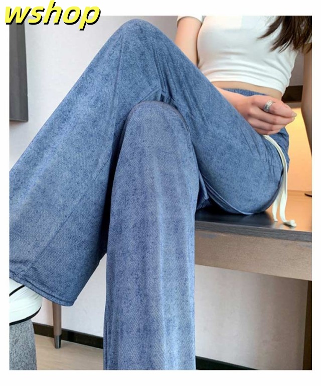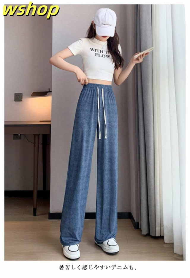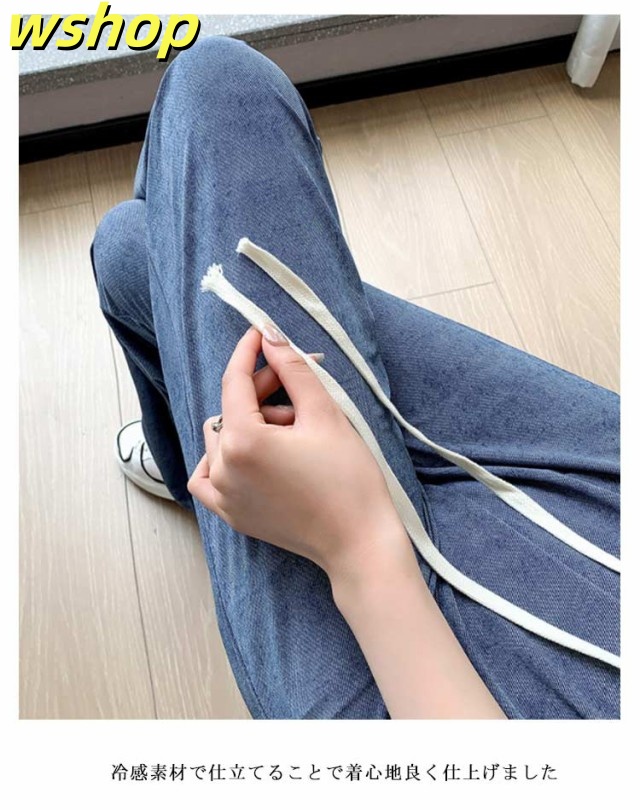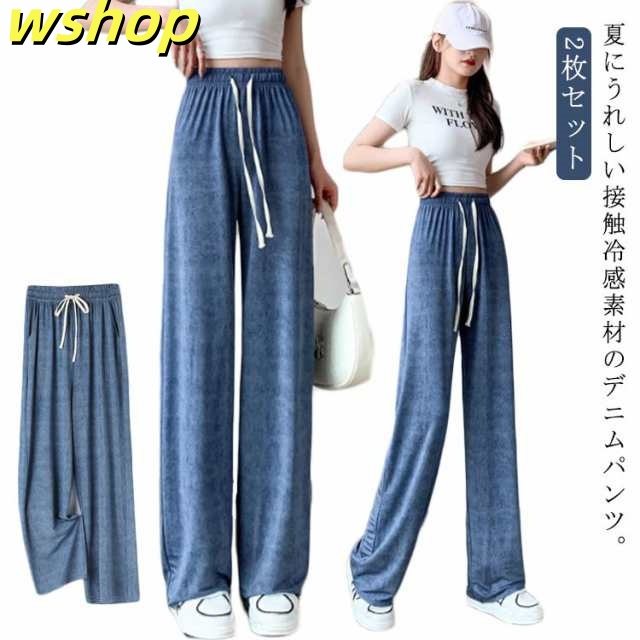 デニム 冷感 2枚組 春 ワイドパンツ ストレート 夏用 デニムパンツ 夏 レディース デニム ワイドパンツ ウエストゴム 接触冷感 夏 ストレートパンツ ひんやり UVカット 無地 薄手 涼しい ロング丈 デニム ジーンズ