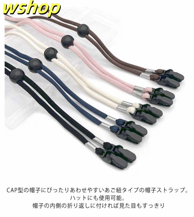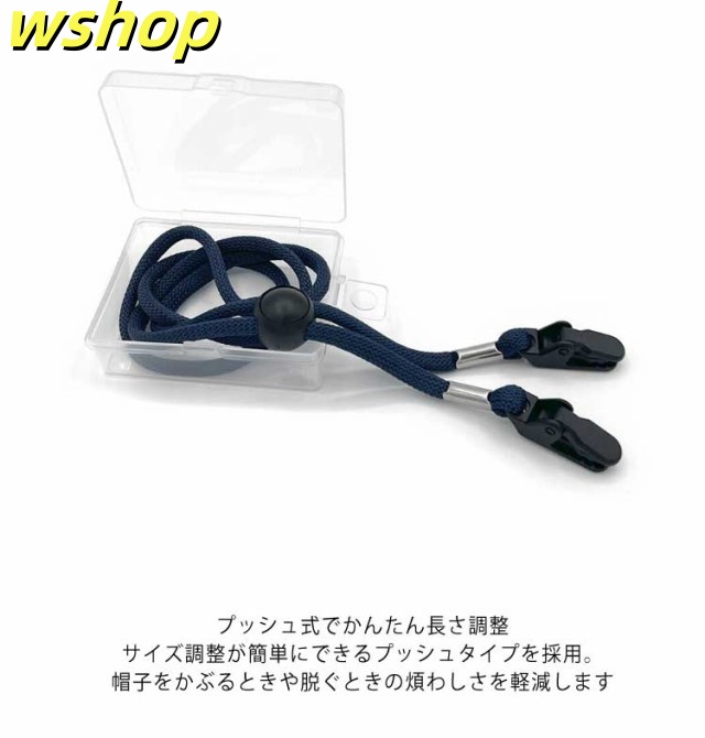| 帽子を風から守る! どの帽子にも取付けできるクリップ式あご紐 【2枚セット 収納ケース付き】 取り付け簡単であご紐として使える♪ 風が強い日や自転車に乗る時など、帽子が飛ばされにくくなります♪ お帽子やお洋服の襟元に挟むだけのクリップタイプ。安心してお使いいただけるよう少し大きめのクリップを採用しました。 CAP型の帽子にぴったりあわせやすいあご紐タイプの帽子ストラップ。 ハットにも使用可能。帽子の内側の折り返しに付ければ見た目もすっきり♪ 簡単楽ちん♪サイズ調整。押しながら上下させるだけで簡単に調整いただけます。 約80cmの余裕を持った長さなので操作もしやすくおしゃれな印象♪ レディース・メンズ・子供からお年寄りまで使える帽子クリップ! <details> 01.二重構造のクリップ式 クリップ式なのでどんな帽子にもあわせることができます。2重クリップタイプなので外れにくい構造になっています 02.耐久性のあるストラップ 弾力性がある丸太紐の丈夫な素材。ゴム素材のひものように伸びきってしまうということはありません。 03.プッシュ式でかんたん長さ調整 サイズ調整が簡単にできるプッシュタイプを採用。帽子をかぶるときや脱ぐときの煩わしさを軽減します 04.専用の収納ケース付きで保管にも便利 個包装のケースに入っているので、衛生的に保管できます。ケースに入れて持ち運びもOK! | |