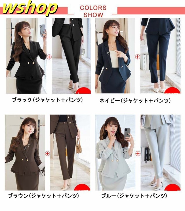 | 色 | ブラック(ジャケット+パンツ) ブラック(ジャケット+スカート) ネイビー(ジャケット+パンツ) ネイビー(ジャケット+スカート) ブルー(ジャケット+パンツ) ブルー(ジャケット+スカート) ブラウン(ジャケット+パンツ) ブラウン(ジャケット+スカート) |