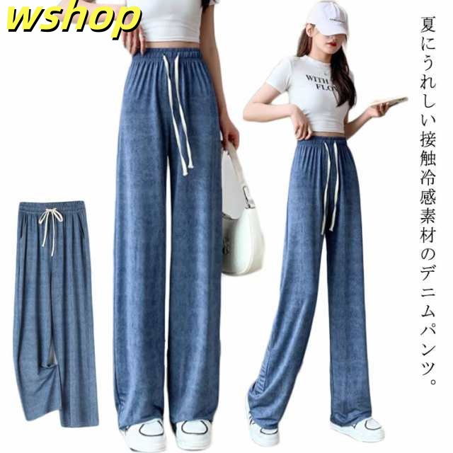 即納OK SNS話題 デニムパンツ ジーンズ ルームパンツ ボ ストレートパンツ ワイドパンツ ロング丈 薄手 さらてろパンツ 接触冷感 デニム ズボン 春 無地 夏 とろみ 着痩せ ストレート リラックスパンツ ひんやり 涼しい UVカット ウエストゴム 体型カバー ゆったり 今だけ限定