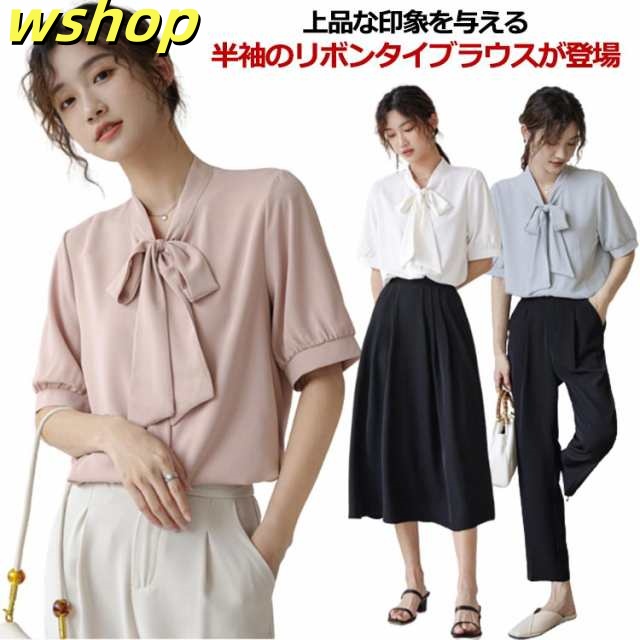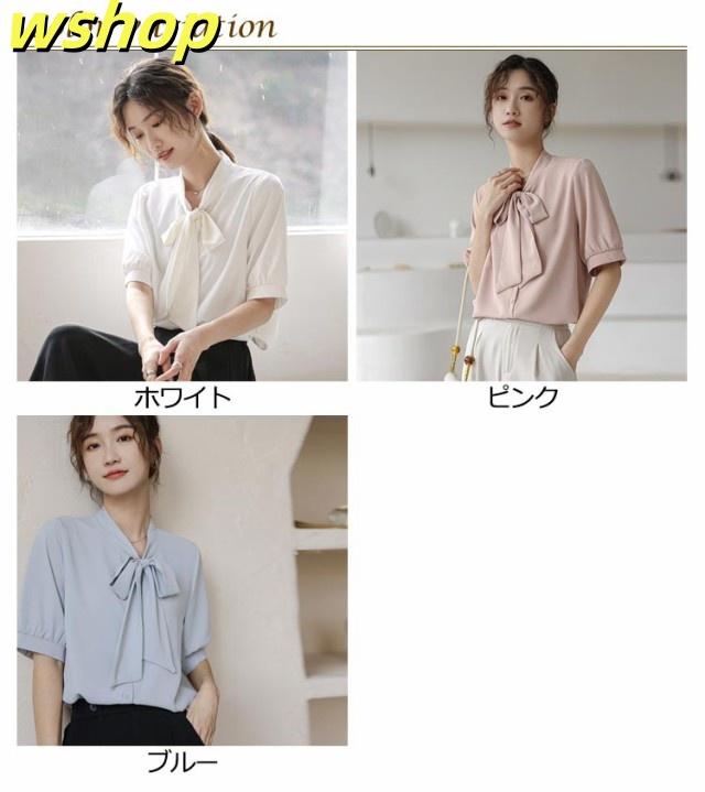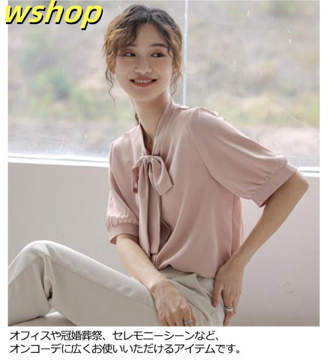 ボウタイ ブラウス 半袖 シャツ オフィス ボウタイ付きブラウス レディース シフォンブラウス リボン 女性 パフスリーブ とろみ 華やか プルオーバー トップス シンプル 通勤 通学 ビジネス カジュアル 上品 きれいめ フォーマル 入学式 卒業式 入園式 卒園式 送料無料