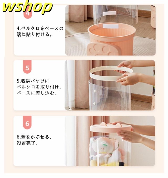 | ぬいぐるみたちの新しい家を作る!ぬいぐるみ収納ボックス。 各種のぬいぐるみ、高い外観レベルを収納することができます。 DIY人形収納バケツ。ぬいぐるみはこのように収納することができて、普段私の人形たちは麻袋の中で密封して、日の目を見ないで今~やっと展示することができます。 ディスプレイケース。ようやくぬいぐるみが収納できる場所ができた、防塵・防湿 大容量収納 巨大な丸い収納桶。 玩具収納!両面テープは不要!筒が崩れにくく、しっかりしている。 1.保護フィルムを剥がす。 2.ラッチの隙間を合わせる。 3.ラッチをロックする。 4.べルクロをペースの端に貼り付ける。 5.収納パケツにべルクロを取り付け、 ベースに差し込む。 6.蓋をかぶせる、設置完了。 | |