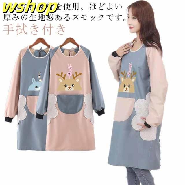 袖付きエプロン スモック 割烹着 かわいい エプロン 保育士 ロング チュニック おしゃれ 防水 防汚 手拭き付き レディース 介護士 母の日 プレゼント 料理 給食 学校