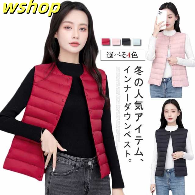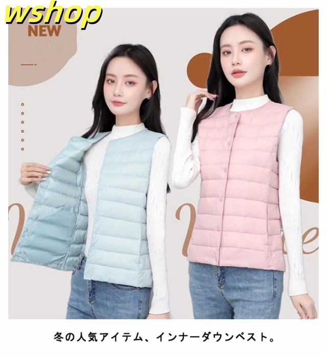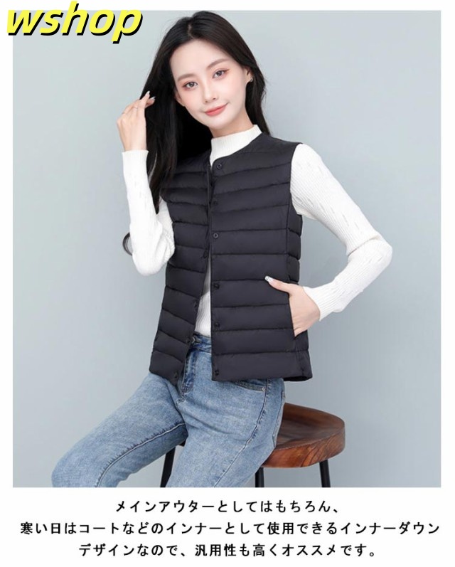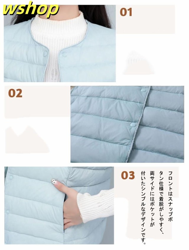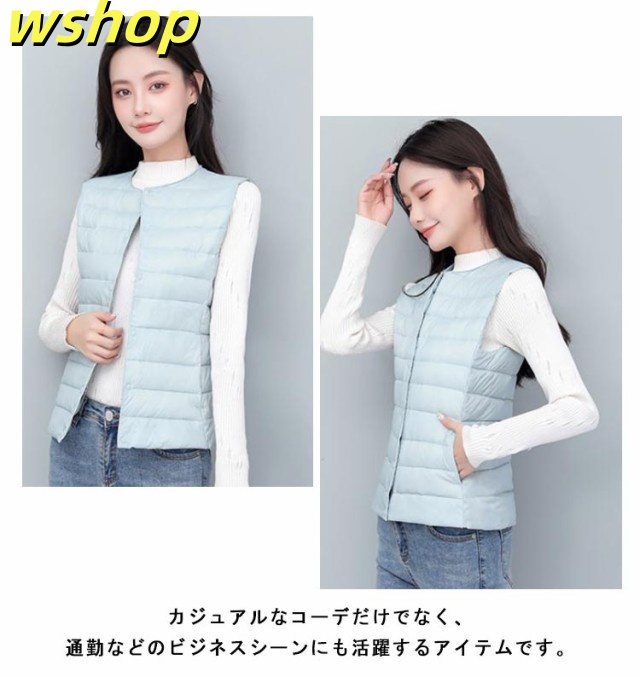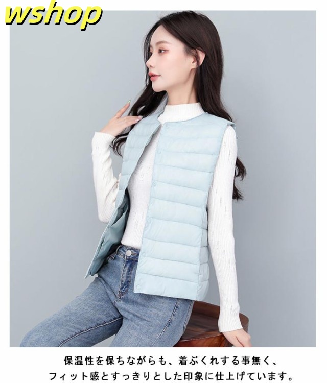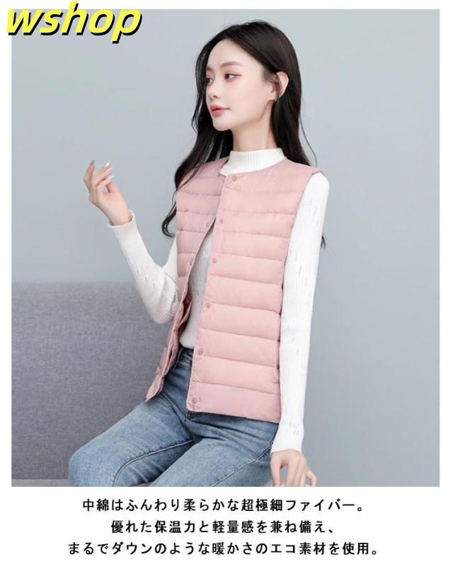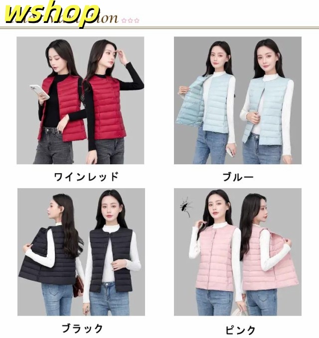 【wshop 】ライトダウン インナーダウン ベスト レディース ダウンベスト 中綿ベスト ファイバーダウン ベスト ノーカラー ダウンジャケット ショート丈 スリム コンパクト 大きいサイズ 軽量 薄手 秋冬 暖かい あったか 防寒 保温 30代 40代 50代 大人 おしゃれ 【送無】