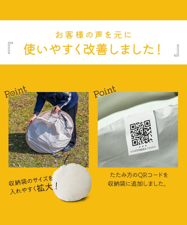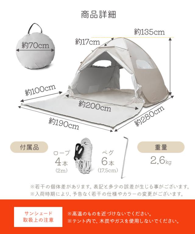 | 素材 | 190Tポリエステル (シルバーコーティングUPF50+) メッシュ:ポリエステル100% 天井フック:PP 日さしパイプ:D6.9mmグラスファイバーポール |