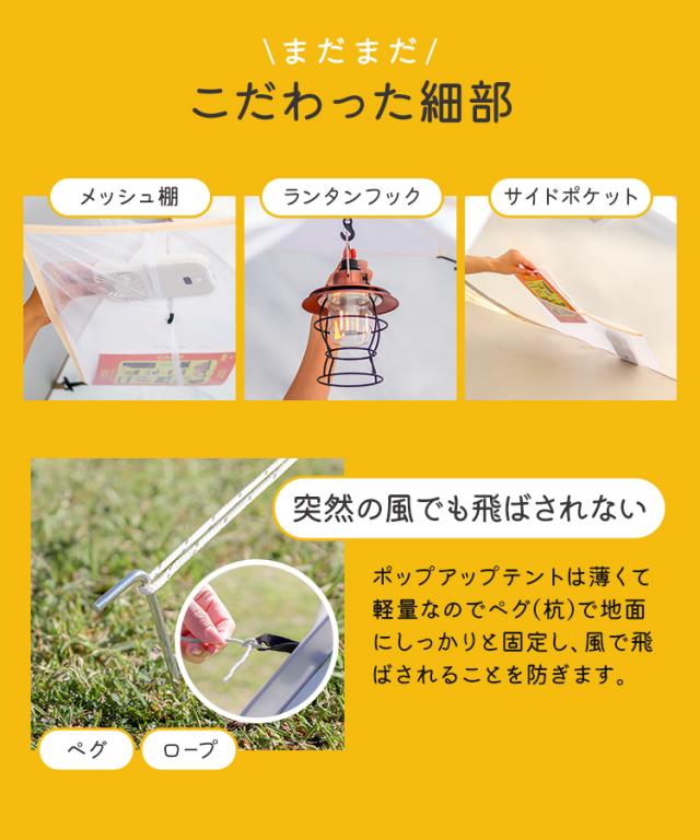 | 内容 | テント本体 ロープ 4本 ペグ 6本 持ち手付き収納バッグ |