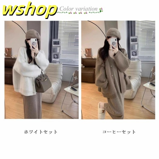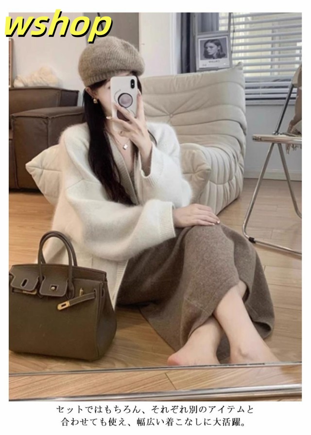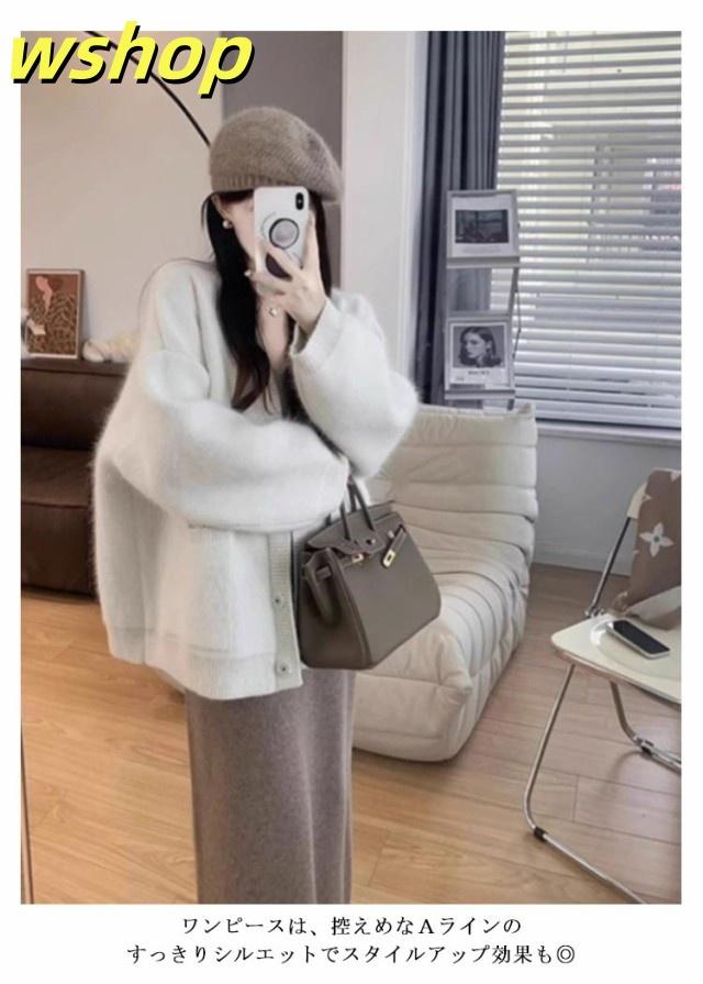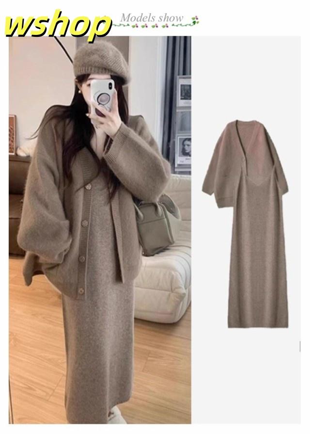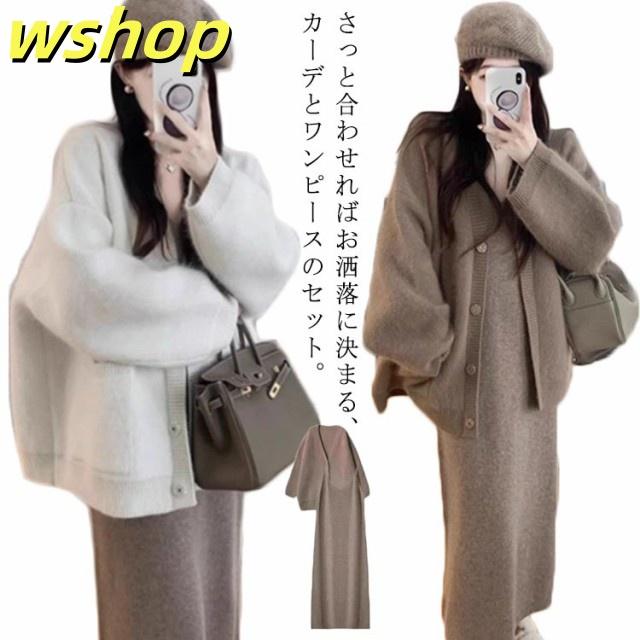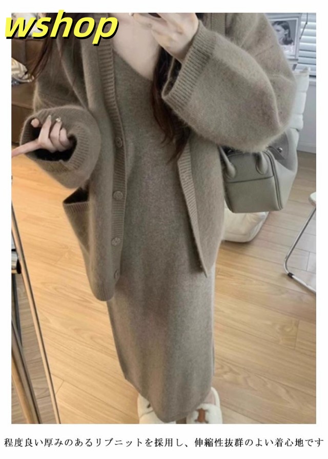 【wshop 】セットアップ カーディガン ニットワンピース レディース 秋冬 2点セット ニット ワンピ 無地 柔らかい 暖か 着?せ ノースリーブワンピース 長袖 タンクワンピース カジュアル ロング 膝丈 ひざ丈 体型カバー ゆったり 大人 秋 冬 オフィス OL 通勤 送料無料