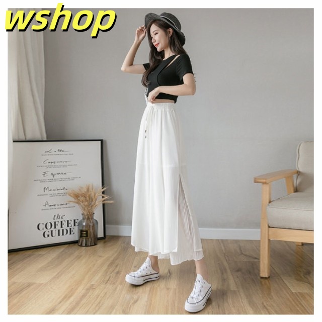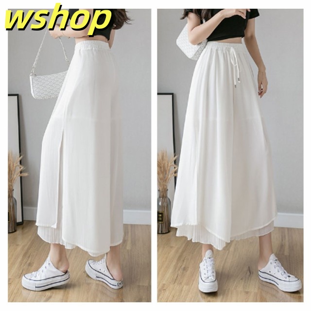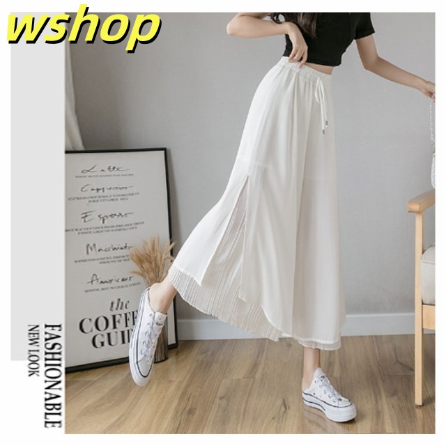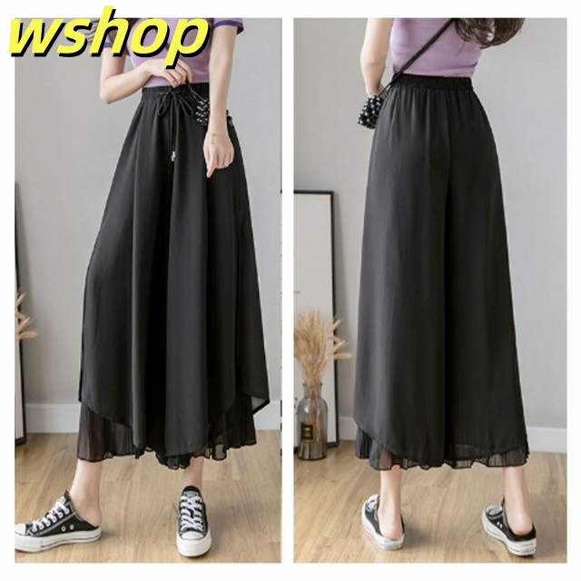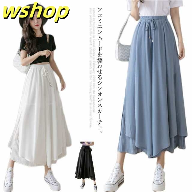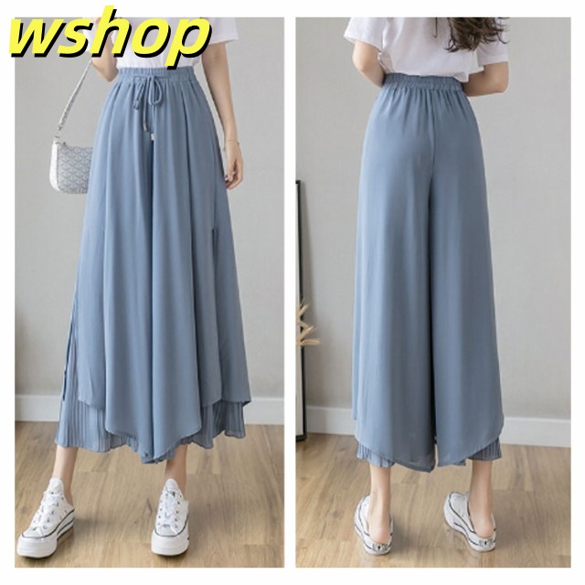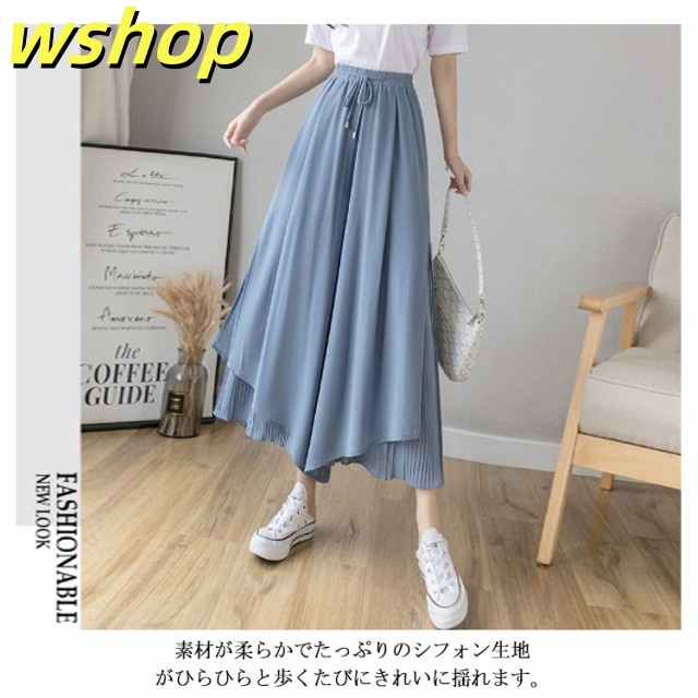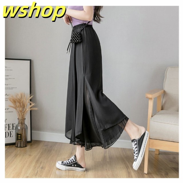 新登場 SNS話題 【wshop グロッシープリーツ ガウチョパンツ ロング丈 】【送料無料】シフォンワイドパンツ 体型カバー 綺麗 ボ ゆったり リブフレアパンツ ウエストゴム スカーチョ 細く見える 細身 2枚重ね サイドスリット レディース ふんわり スカンツ 今だけ限定
