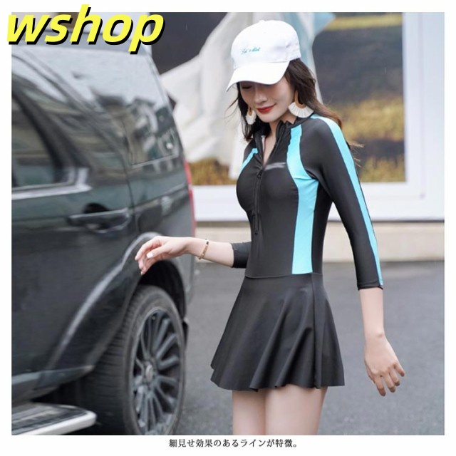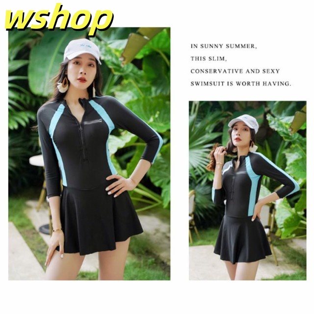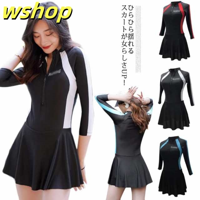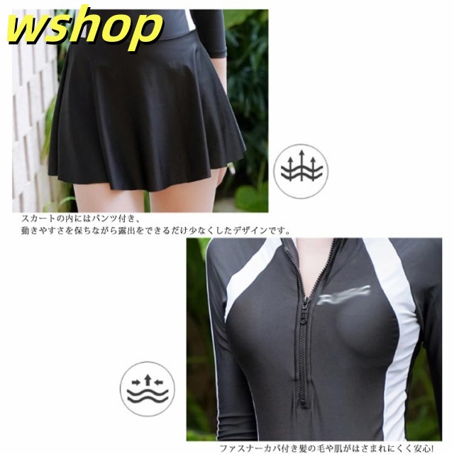| ひらひら揺れるスカートが女らしさUP! 長めの袖丈で、紫外線から腕を守ります。 素材には伸縮性がある素材で動きやすい。 シンプルなワンピースタイプの水着でスリムに見せてくれる効果があります。 スカートの内にはパンツ付き、動きやすさを保ちながら露出をできるだけ少なくしたデザインです。 | |