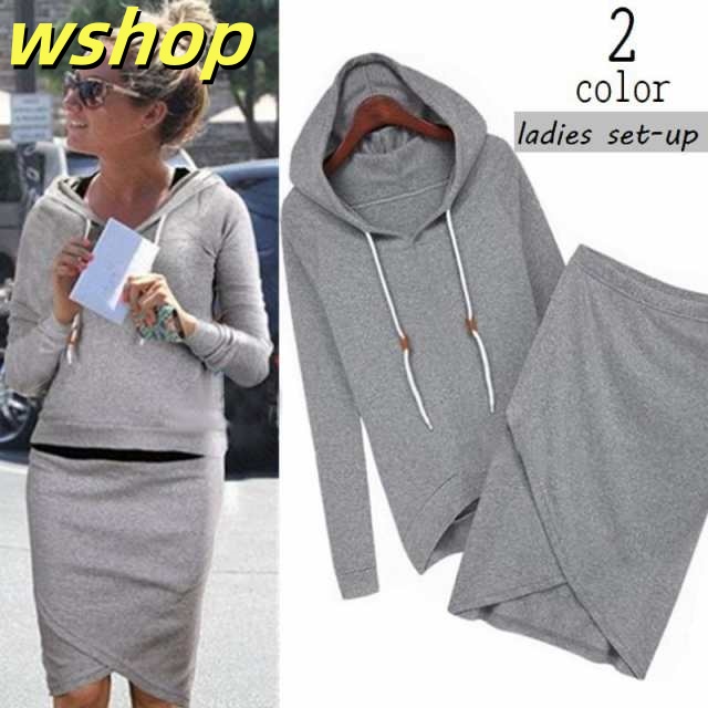 セットアップ スウェット パーカー スカート 2点セット レディース 女性用 長袖 膝丈 無地 ウエストゴム フード付き ポケット付き カジュアル お