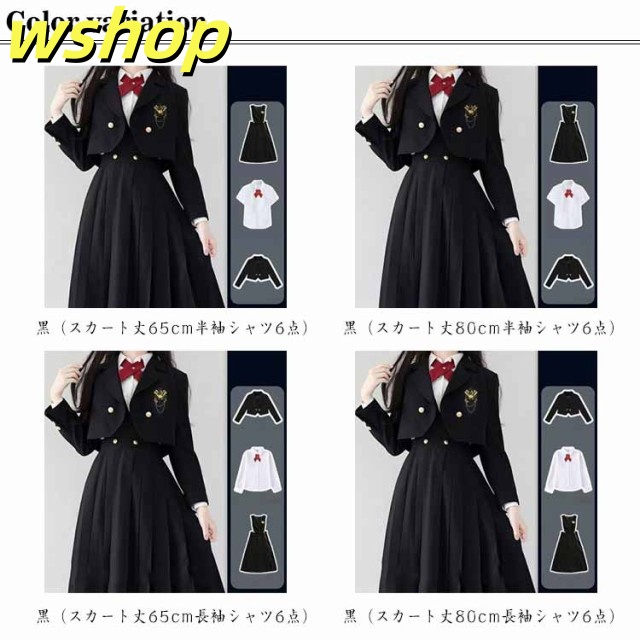 | 色 | 黒(スカート丈65cm半袖シャツ6点) 黒(スカート丈80cm半袖シャツ6点) 黒(スカート丈65cm長袖シャツ6点) 黒(スカート丈80cm長袖シャツ6点) |