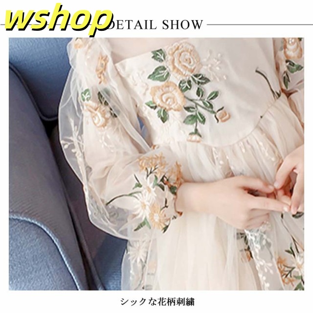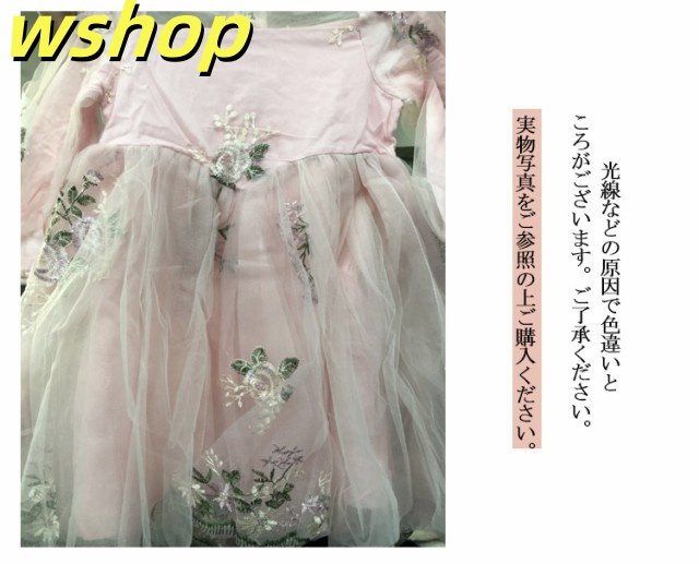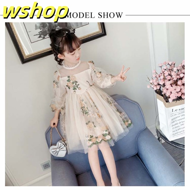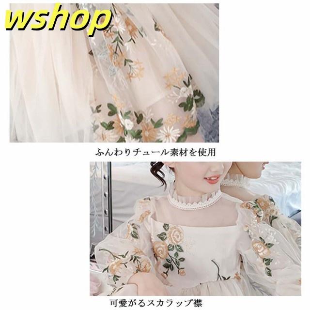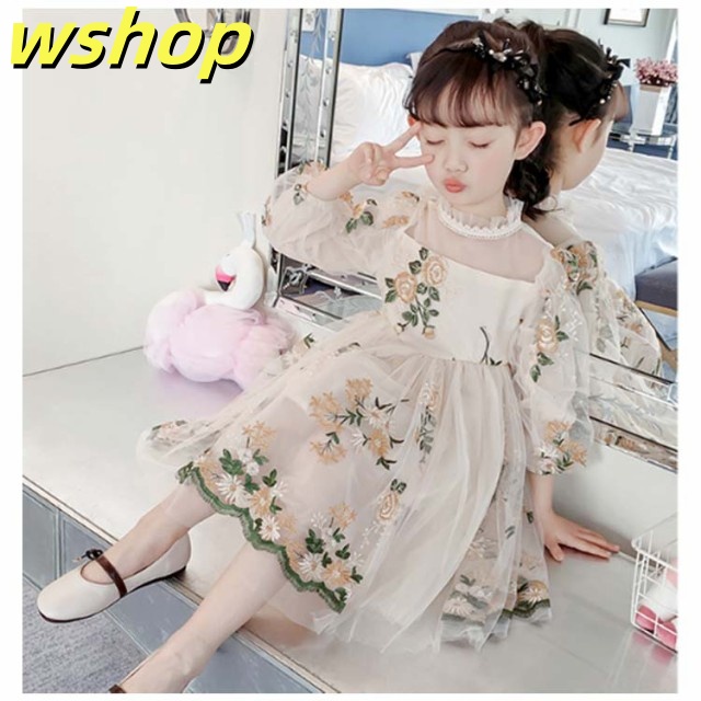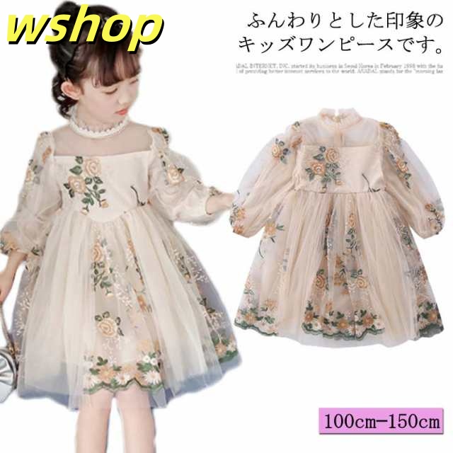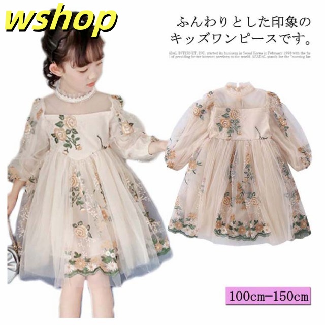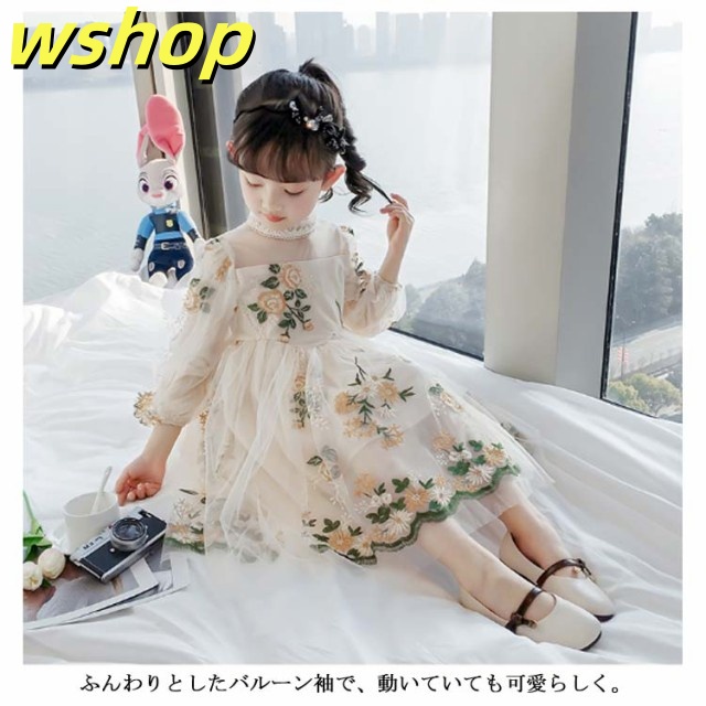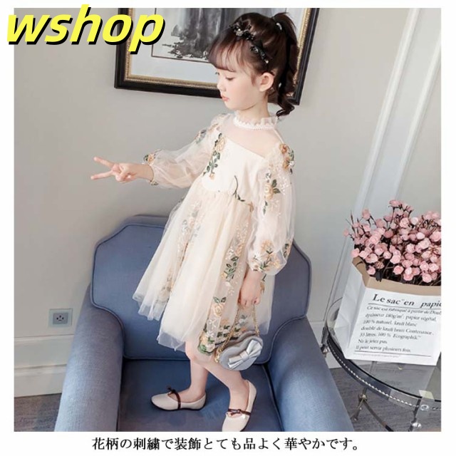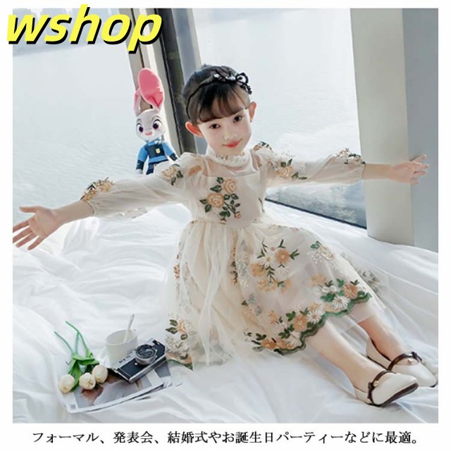 【wshop 】子供ワンピース チュールワンピース ドレス 花柄刺繍 長袖ワンピース ふんわりチュール ハイネック スカラップ襟 レースワンピース フォーマルワンピース 女の子 結婚式 七五三 パーティー チュールドレス 発表会 可愛い 新作 100 110 120 130 140 150