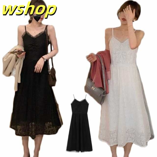 【wshop 】送料無料 レディース Vネック キャミソール ミモレ丈 セクシー ワンピース フレアワンピース 春夏 フレア裾 夏 着痩せ ロングワンピース レース付き チュールワンピース おしゃれ Aライン ノースリーブ 無地 プリーツ ミディアム丈