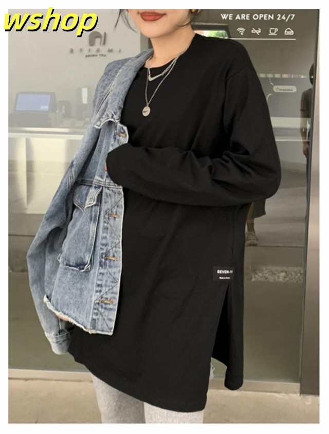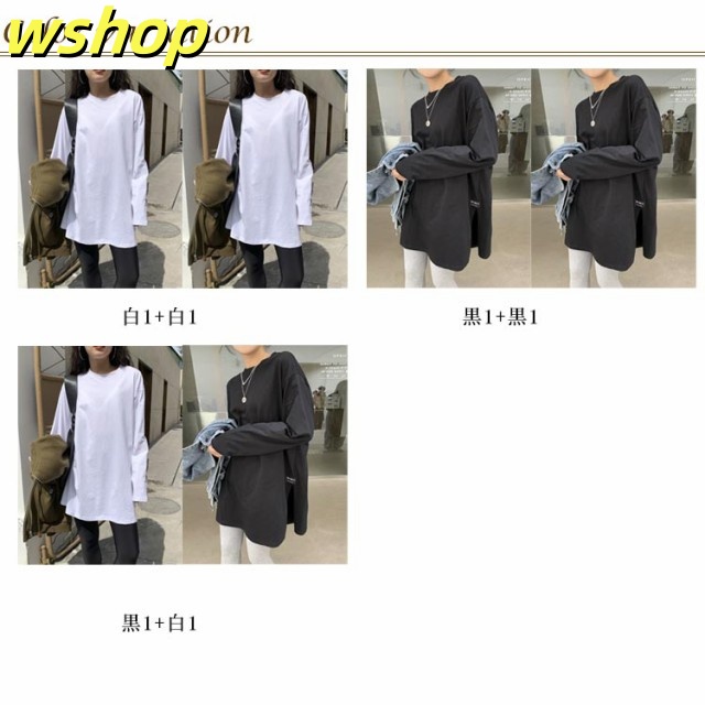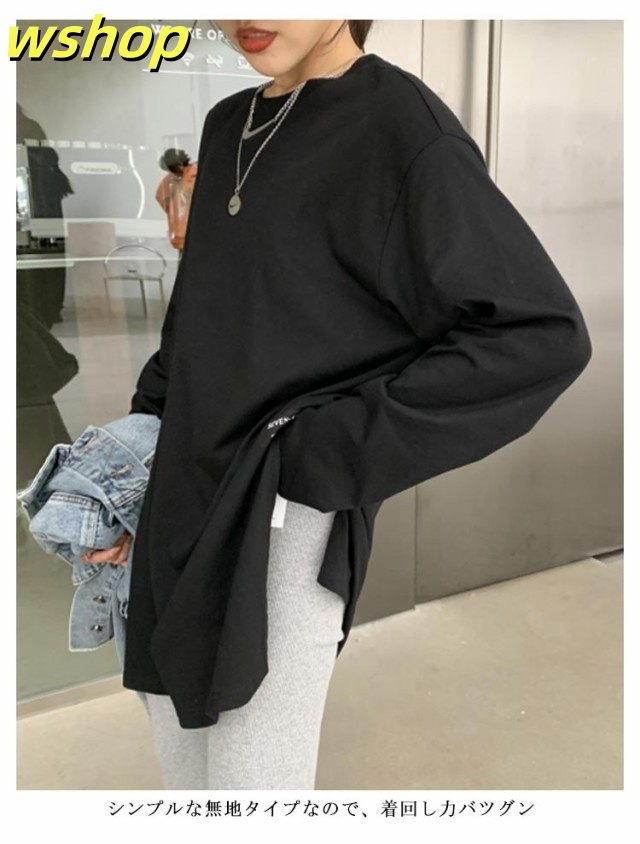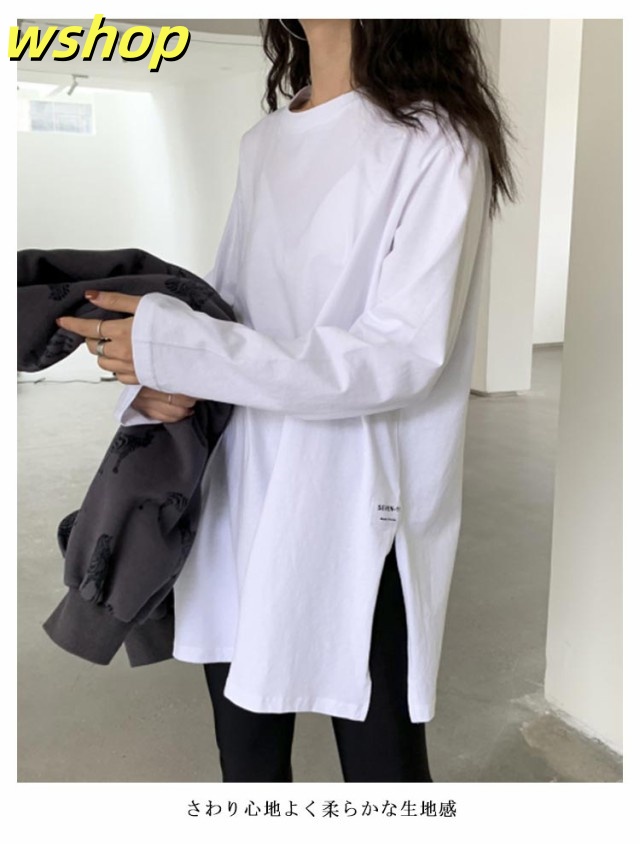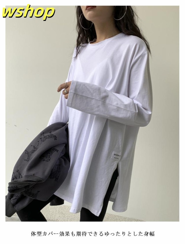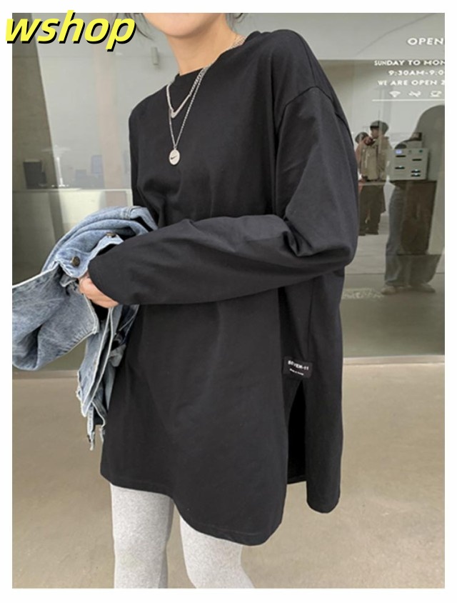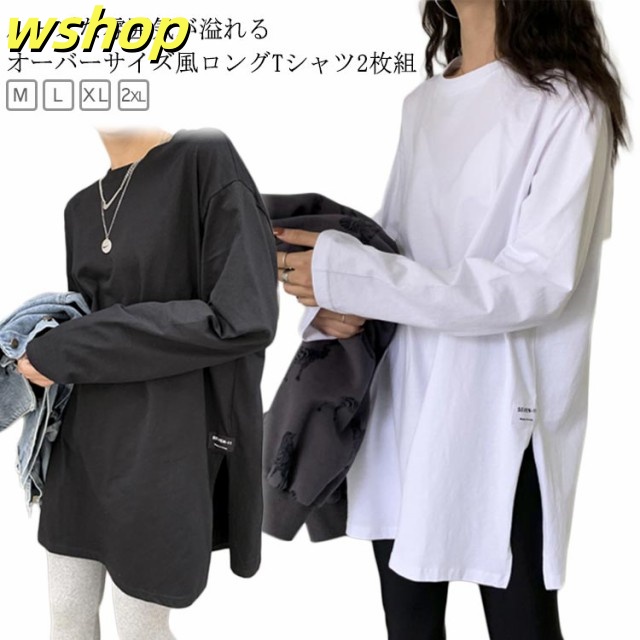 注目ランキング上位 品質安心 ロゴ 2枚組 レビュー高評価 スリット 【wshop 長袖tシャツ ロング丈 Tシャツ 即納OK ゆったり プルオーバー ドロップショルダー ラウンドネック 】レディース 送料無料 ゆるTシャツ 無地 ロングTシャツ 長袖 トップス カットソー 数量限定入荷