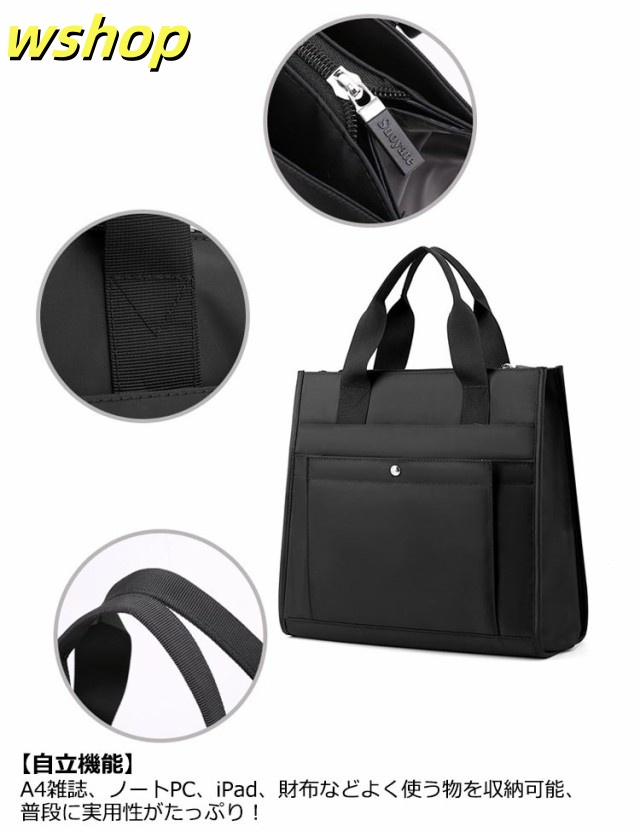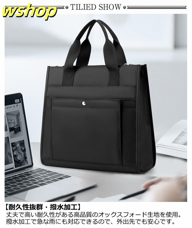 | ビジネスバッグ A4サイズ ハンドバッグ 丈夫 撥水加工 【耐久性抜群・撥水加工】 丈夫で高い耐久性がある高品質のオックスフォード生地を使用。撥水加工で急な雨にも対応できるので、外出先でも安心です。 【見た目以上の収納力】 A4雑誌、ノートPC、iPad、財布などよく使う物を収納可能、普段に実用性がたっぷり! 【自立機能】 バッグが自立するため、取り出しやすく、立てたまま物を取り出しやすい。忙しい状況でも手軽に利用できます。 | |