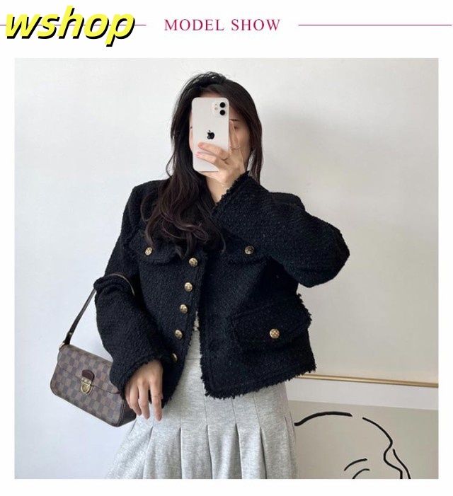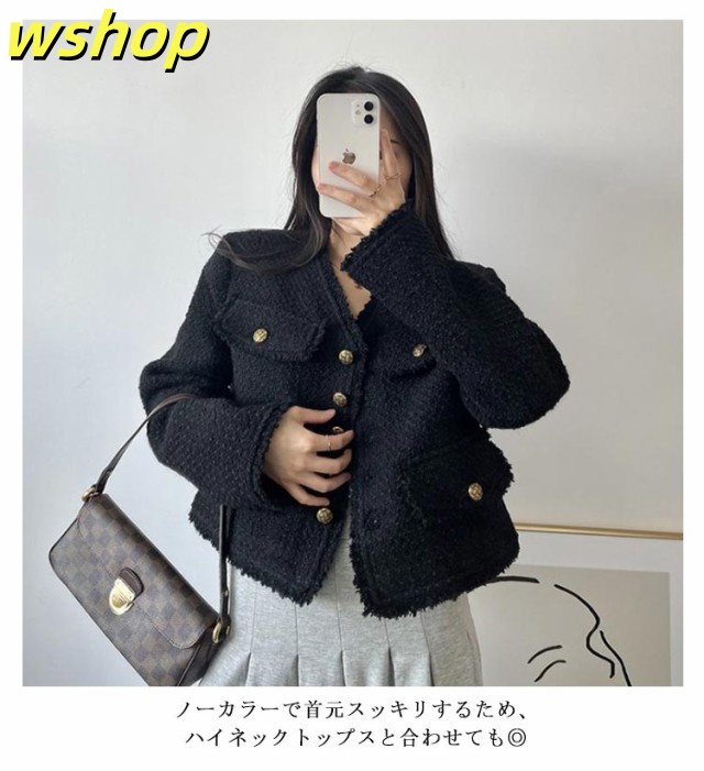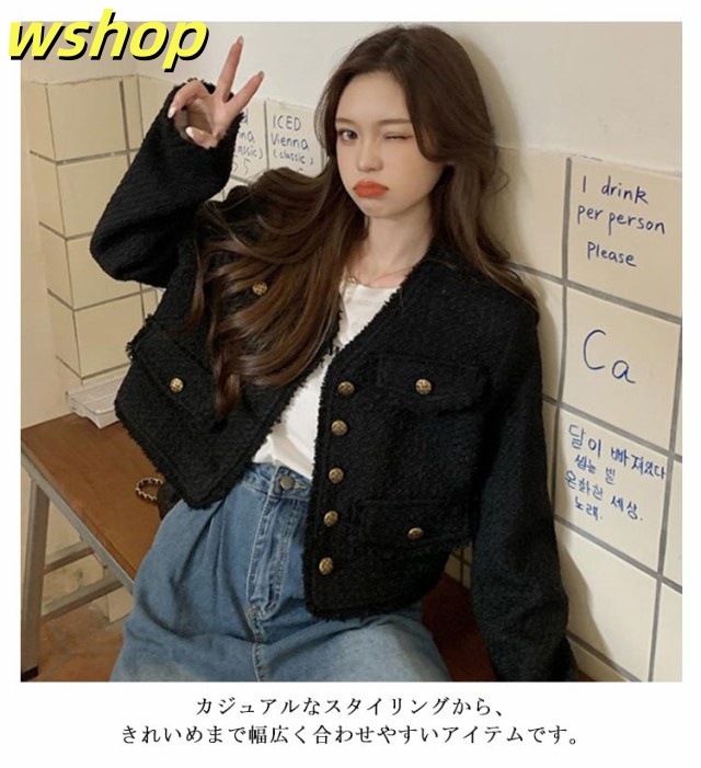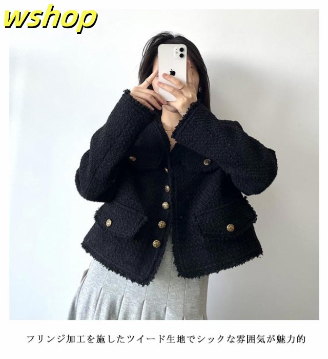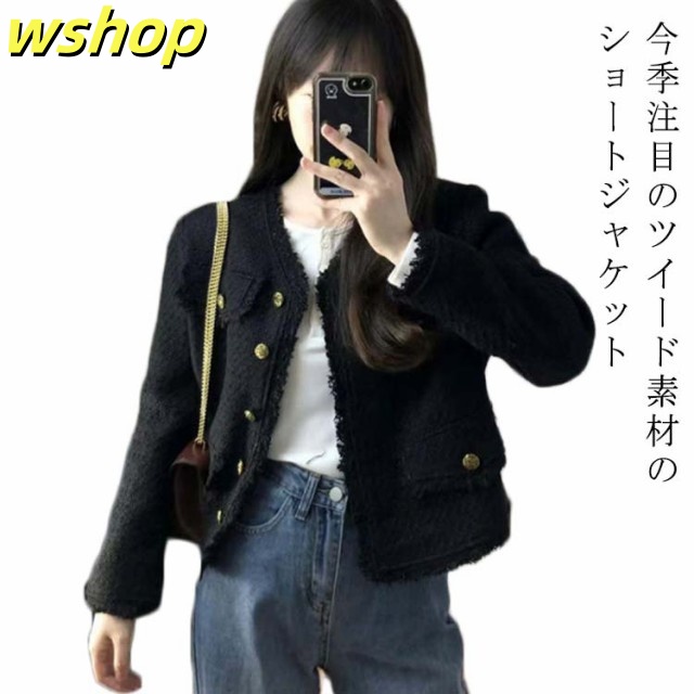 即納OK SNS話題 黒 ファッション 普段使い 通勤 ノーカラージャケット フリンジ おしゃれ カジュアル 薄手 夏 ツイードジャケット ジャケット きれいめ ショートジャケット 】ノーカラー 羽織り 金ボタン 春 ショート丈 ツイード アウター 【wshop 韓国 レディース 送料無料