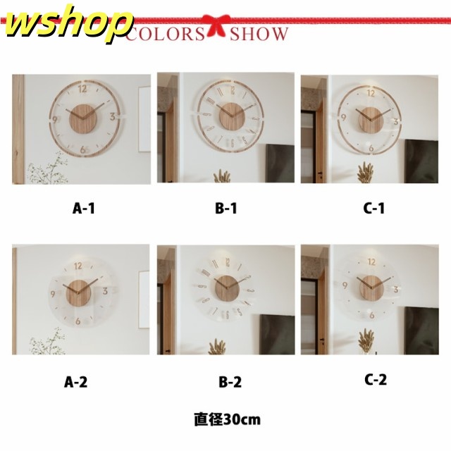 | 【透明な壁掛け時計】【直径30cm】【6タイプ】 木製の針と、曲木のシンプルなフレームが上質感と温もりを感じさせる掛け時計。 北欧テイストでおしゃれな壁掛け時計で、木の温もりが感じられます。 文字盤は背面が透けて見えるのでインテリアによって様々な印象を与えます。 木製のシンプルなデザインなので、大人や子どもを問わずリビングはもちろん、寝室や子供部屋にもおすすめです! どこかレトロでアンティークな感じがかわいいです。 針は音がしない「静音タイプ」を採用し、気になるカチカチ音もありません。 引っ越しお祝い、誕生日、結婚、新築祝いなどのプレゼントにもおすすめな時計です! | |