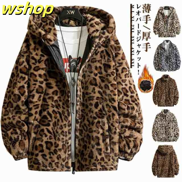 【wshop 】レオパードジャケット ボアジャケット ヒョウ柄 ボア ブルゾン 厚手 メンズ ジップアップブルゾン 薄手 フード付き スタンドカラー ライトアウター パーカー シープボア 羽織 フェイクファー もこもこ 暖かい 厚手 おしゃれ 防寒 秋冬 韓国ファッション 原宿系