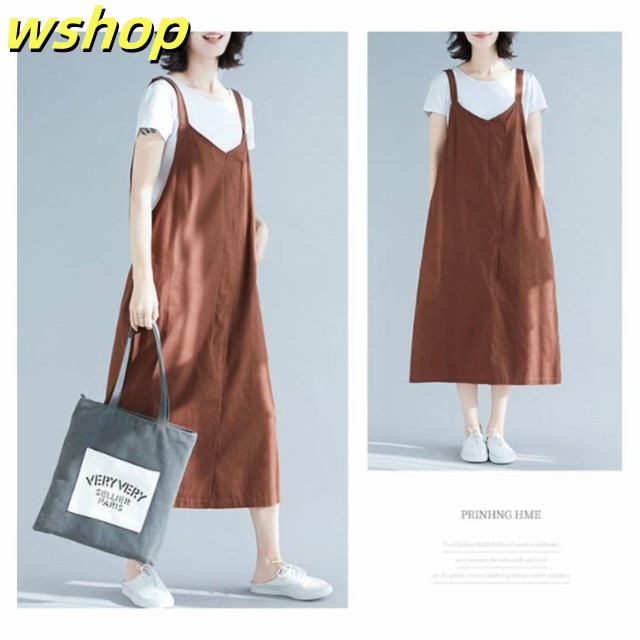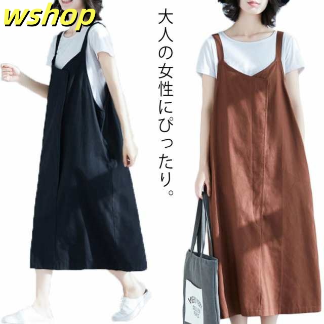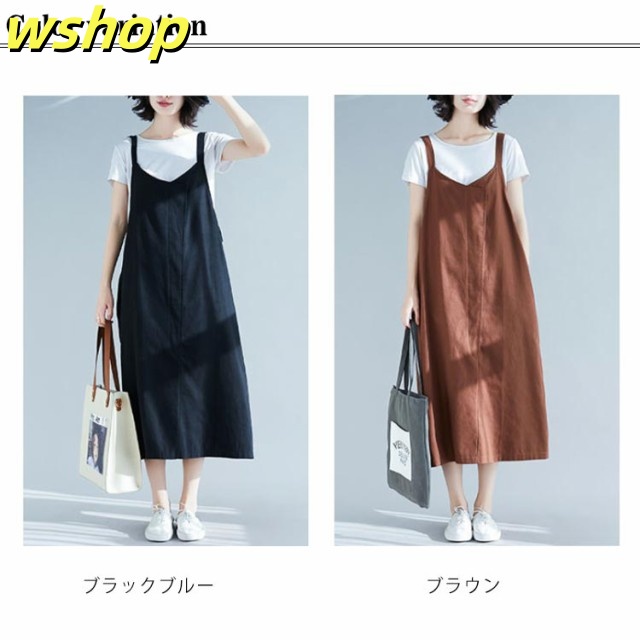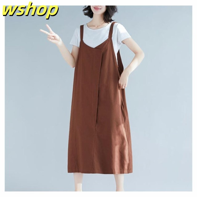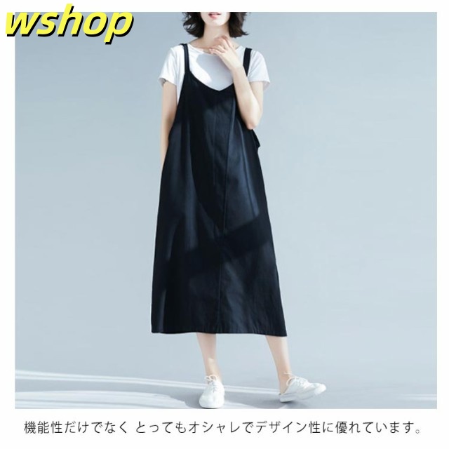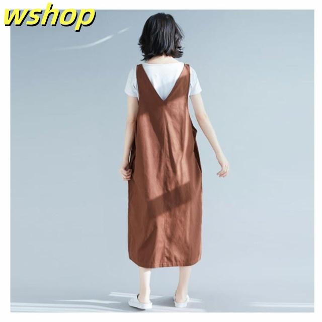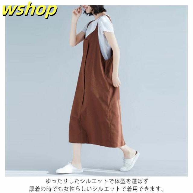 【wshop 】エプロン カフェエプロン 大きいサイズ ジャンパースカート チュニックエプロン サロペットスカート サロペ サロペット ミディ丈 ロング丈 ワンピース レディース かわいい シンプル おしゃれ かぶり 保育士 コットン リネン ゆったり 送料無料
