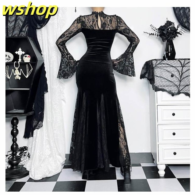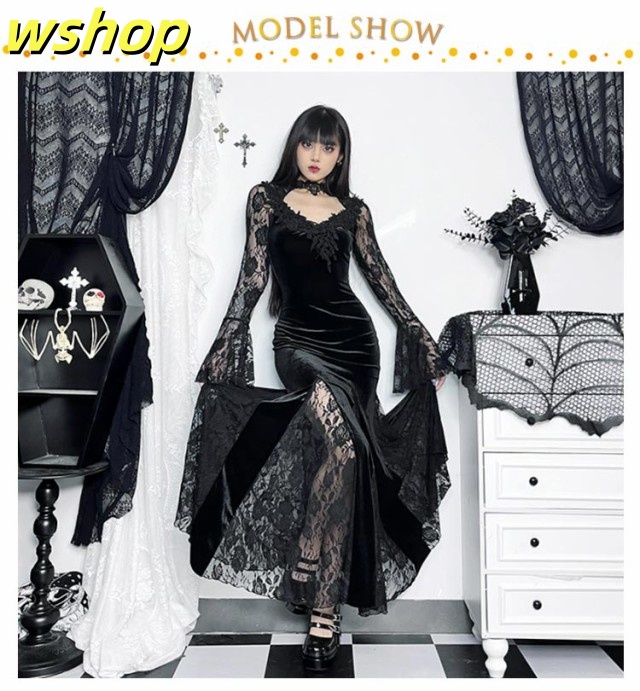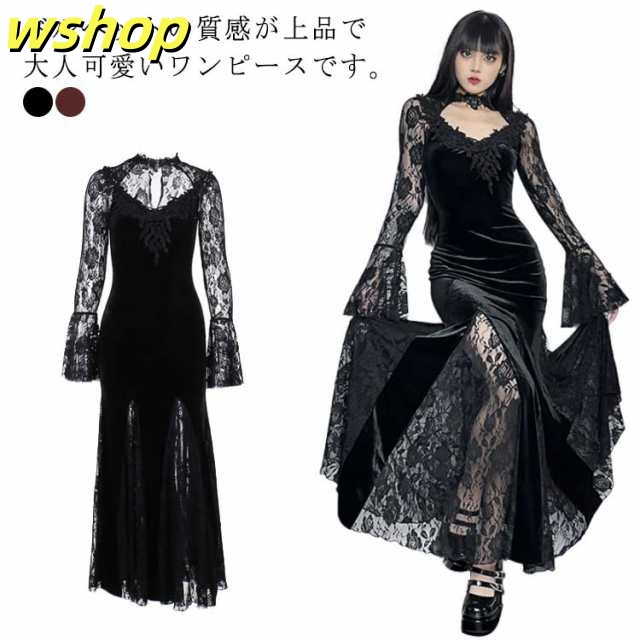 【wshop 】V系 ドレス マーメイド 二次会 パーティー レディース ロング丈 ベロア 結婚式 ワンピース Vネック ビジュアル系 タイトワンピース 袖あり ベルベット 黒 ブラック ゴシック ゴスロリ 魔女 レース 長袖 モード系 サブカル パンク お姫様 秋冬
