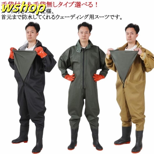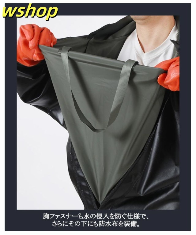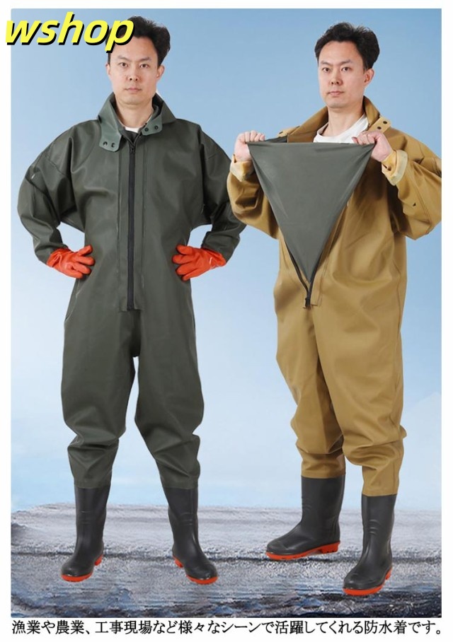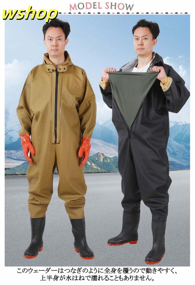 | フード付きつなぎ仕様、首元まで防水してくれるウェーディング用スーツです。 手袋付き&手袋無しタイプ選べる! このウェーダーはつなぎのように全身を覆うので動きやすく、上半身が水はねで濡れることもありません。 フード付きで全身をすっぽり覆ってくれる防水着なので、雨天の作業でも雨風からあなたの体をしっかりガード。 レインコートのように豪雨ではだけることもないので、台風などの緊急時の救護作業でも威力を発揮します。 素材は厚手のPVCで傷つきにくく、水の侵入はもちろん外気からも肌をしっかり守ります。 胸ファスナーも水の侵入を防ぐ仕様で、さらにその下にも防水布を装備。 全体を立体成型しているので動きやすさもバッチリです。 漁業や農業、工事現場など様々なシーンで活躍してくれる防水着です。 | |