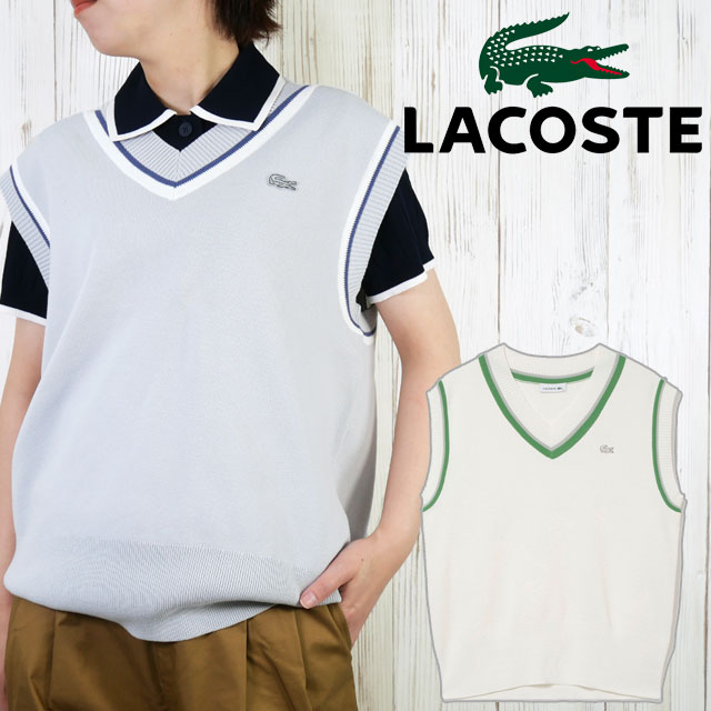 送料無料 チルデンニットベスト レディース SS 春夏 新作 夏新作 秋新作 人気 流行 定番 2025 ラコステ LACOSTE AF017 Vネック ライン入り セーター トップス 袖なし 重ね着 トップス 定番 シンプル アパレル カジュアル ウェア 服 白 グレー ワンポイント ワニ ロゴ