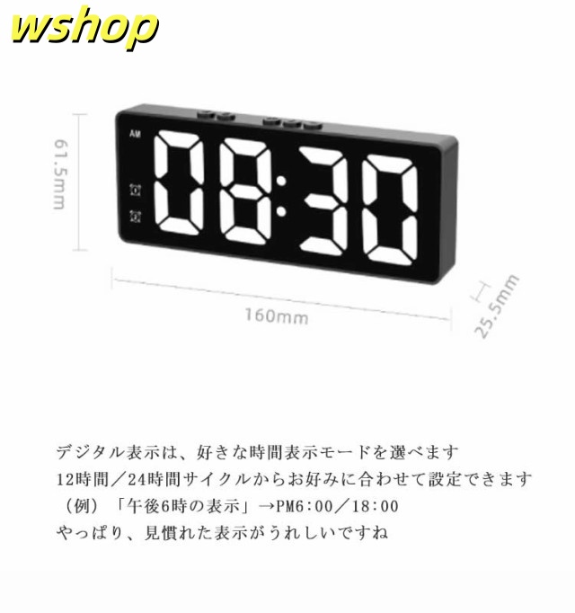 | 【見やすい16cm大型ディスプレイのデジタル時計】 【電池式とUSB式 両対応】 【シンプルで洗練されたデザイン】 【ナイトモードを搭載】 どのようなインテリアにもマッチする、おしゃれ置き時計です 見やすい16cm画面。時刻がLED発光。スリムなアラーム付き時計。USB接続で常時発光。 12時間/24時間サイクルからお好みに合わせて設定できます 夜間など設定した時間になると自動で低輝度になります 作業デスクに置くのはもちろん、アラーム機能もついているのでベッドサイドでも快適に使えます。 さらに、日付と温度表示にも対応! デジタル表示は、好きな時間表示モードを選べます 12時間/24時間サイクルからお好みに合わせて設定できます (例)「午後6時の表示」→PM6:00/18:00 やっぱり、見慣れた表示がうれしいですね | |