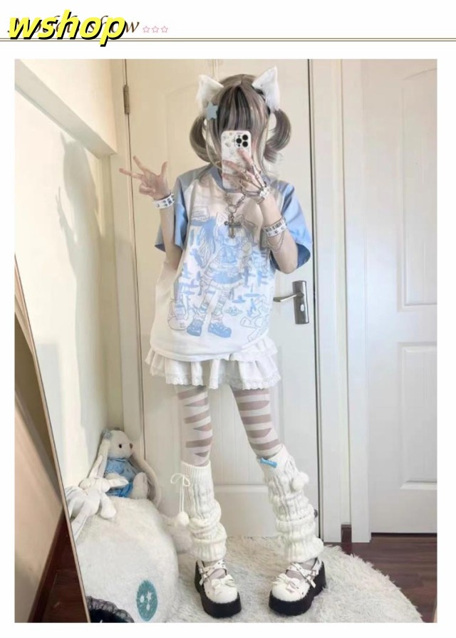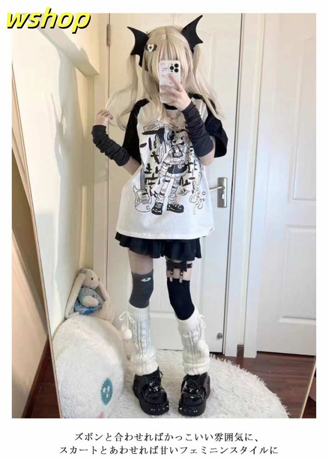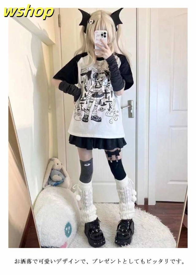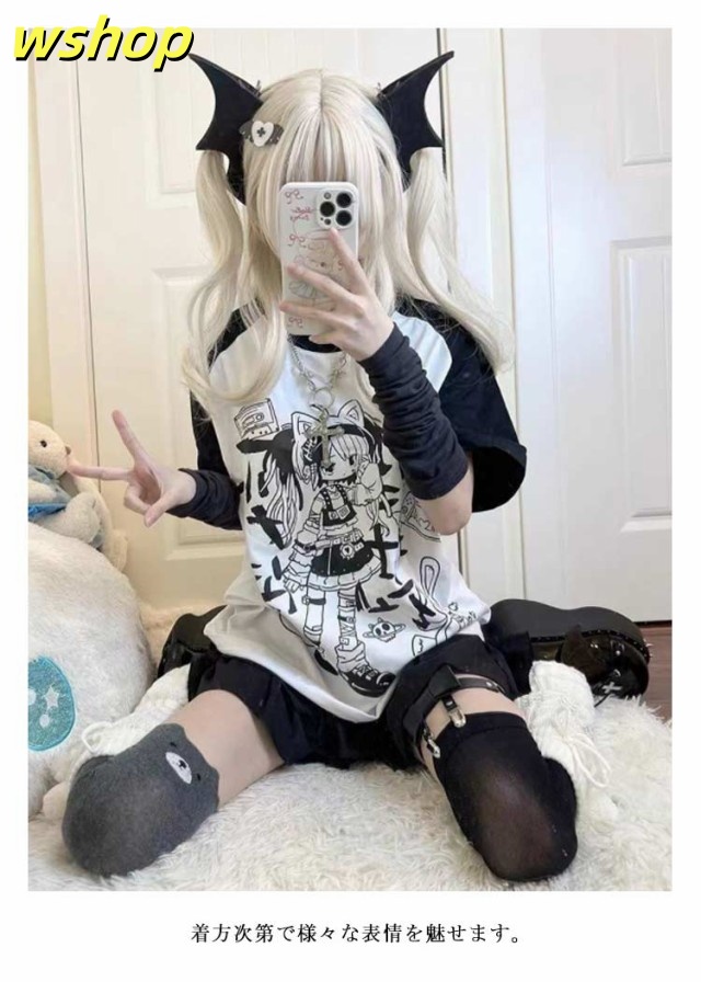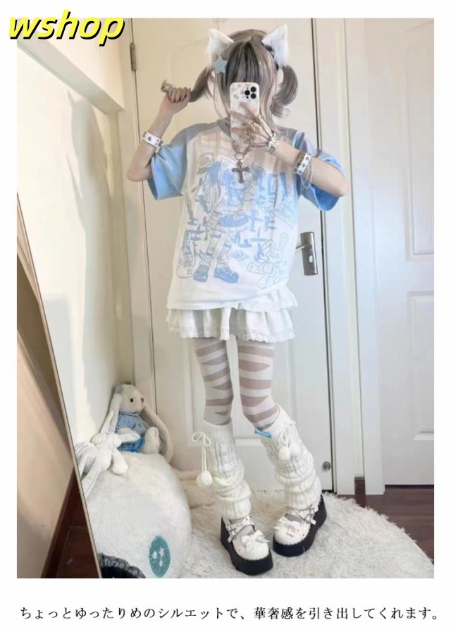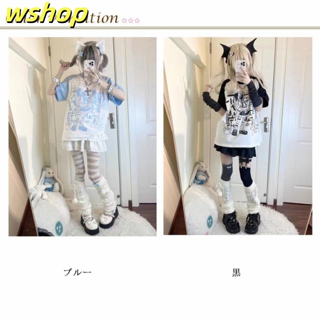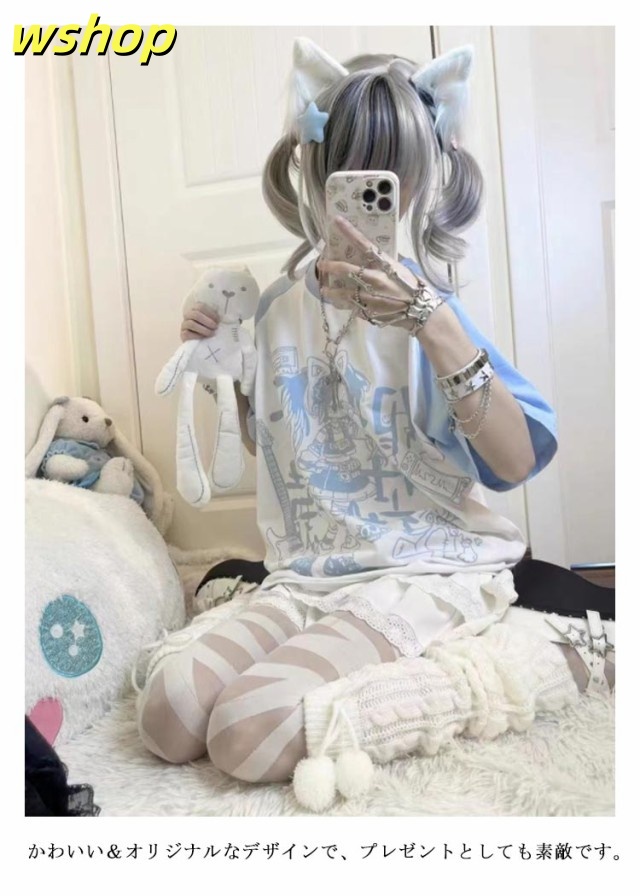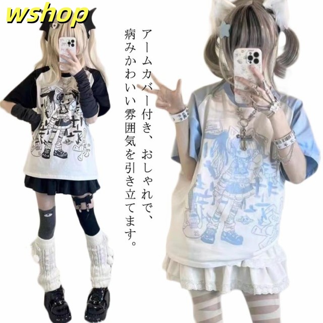 新登場 売上急増中 おしゃれ 【wshop レディース 量産型 トップス プリント ゆったり 天使界隈 病み可愛い 学院風 半袖 カフスなし アニメ 水色 Tシャツ 地雷系 原宿系 カットソー 長袖 サブカル系 ゴスロリ 】アームカバー付き 送料無料