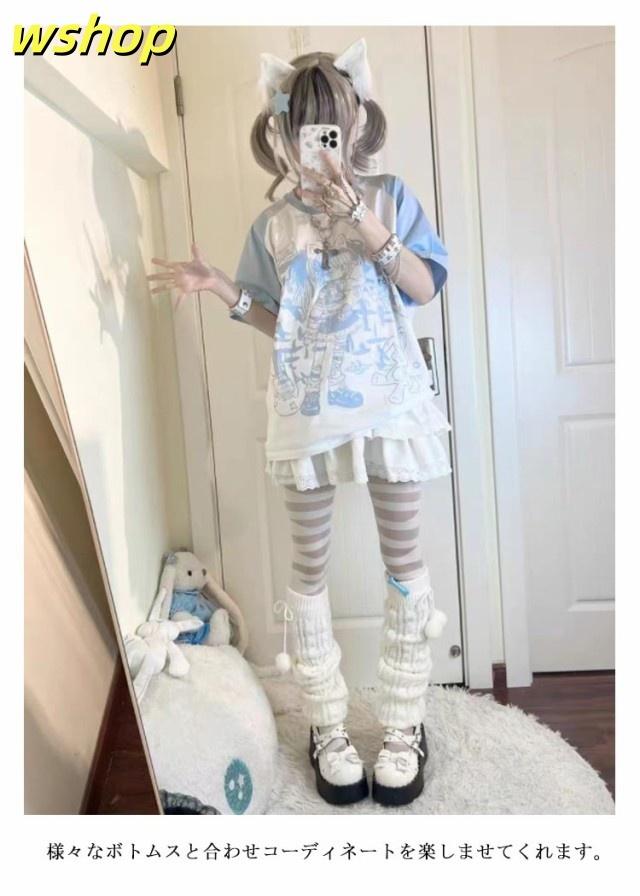アームカバー付き 長袖 Tシャツ トップス レディース 半袖 地雷系 カフスなし 原宿系 アニメ プリント カットソー プリント ゴスロリ 量産型 病み可愛い 学院風 サブカル系 ゆったり 天使界隈 水色 おしゃれ
