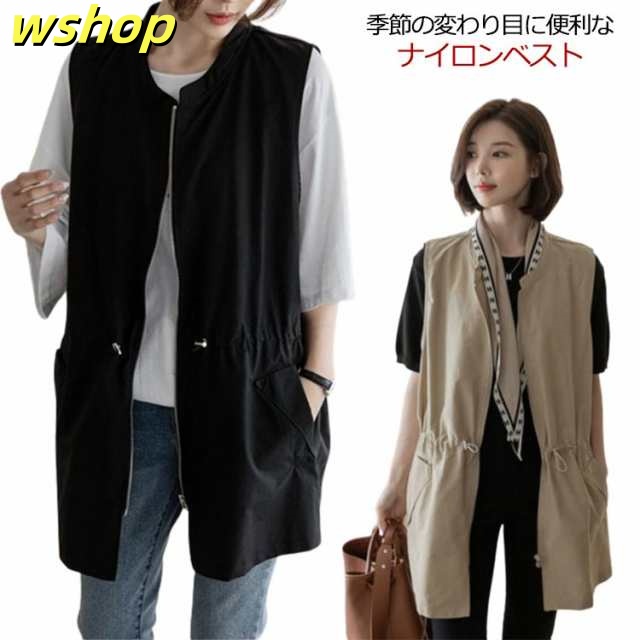 ベスト レディース ナイロンベスト ロング クルーネック ジップアップ ミリタリーベスト 春 夏 薄手 ポケット付き ノースリーブ ジャケット サマージャケット カジュアル 韓国風 無地 秋 30代 40代 50代 レイヤード 重ね着 【送料無料】