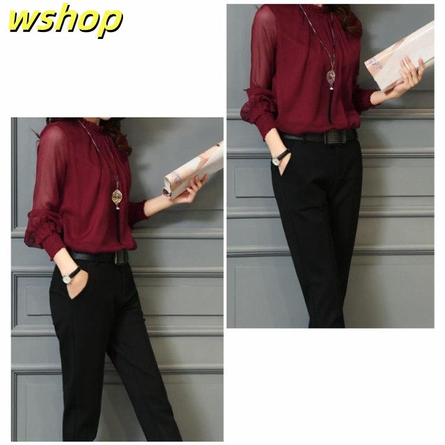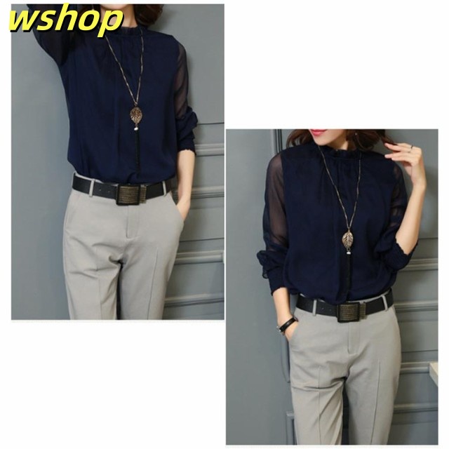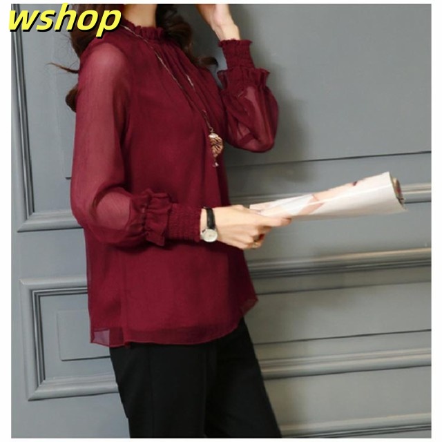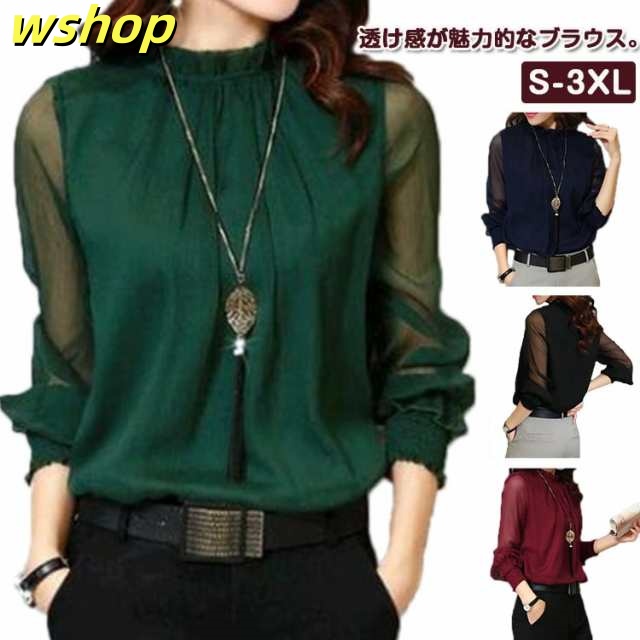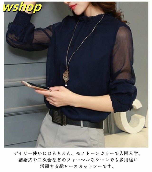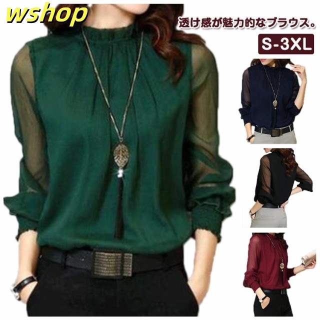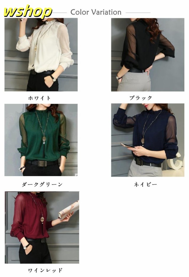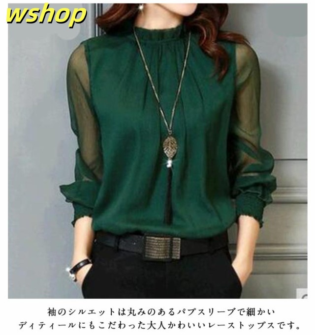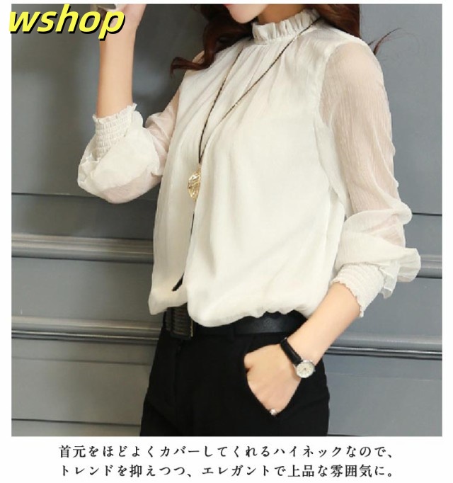 【wshop 】ブラウス Tシャツ レディース 無地 ブラウス シフォン チュール トップス インナー カットソー シースルー ハイネック 着痩せ 長袖 シャツ 春ブラウス レース 透け感 大きいサイズ フリル袖 ゆったり 韓国ファッション カジュアル きれいめ 春 夏 秋 冬