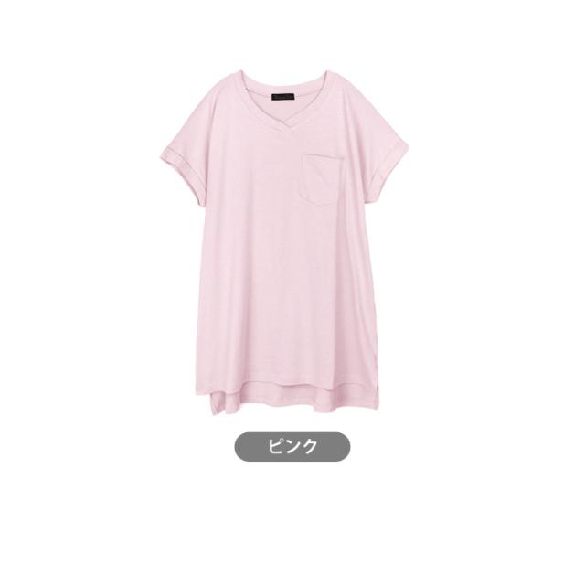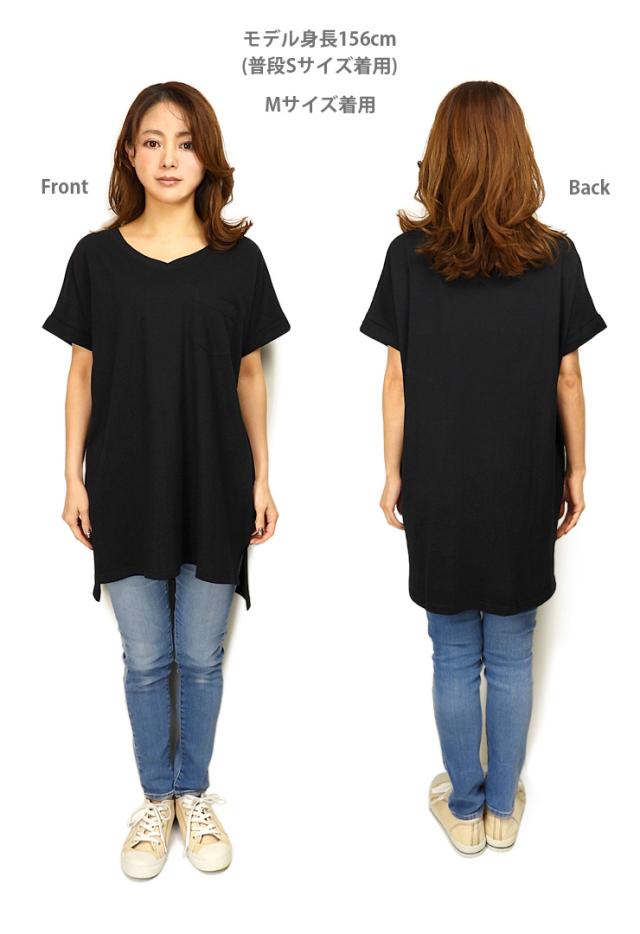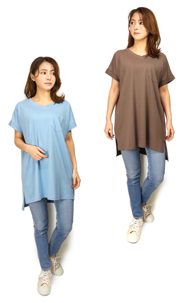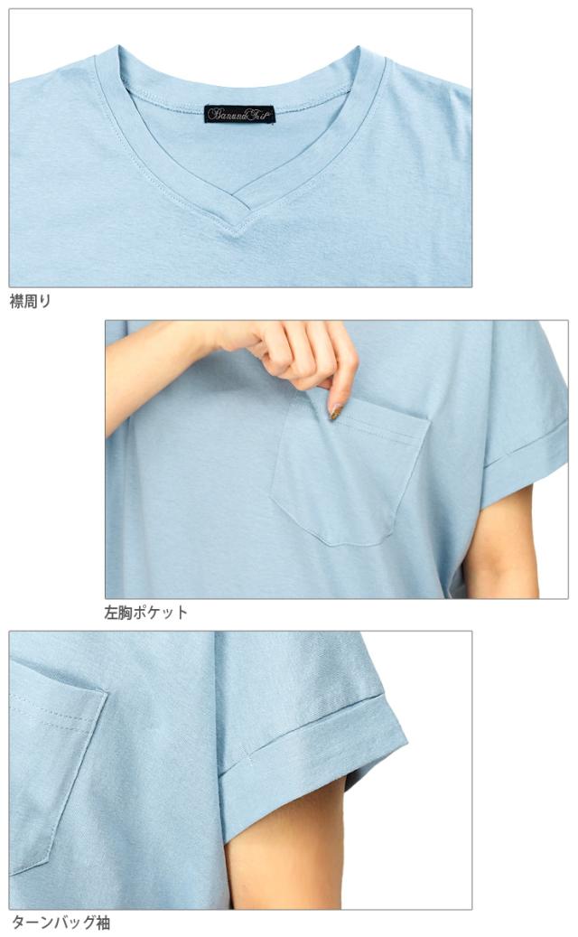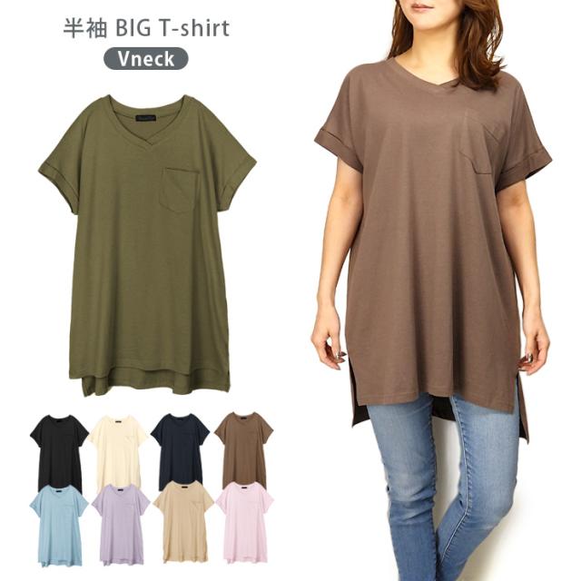 【メール便送料無料】Vネック コットン 半袖 BIG Tシャツ M L レディース 春夏秋 全9色 カットソー 綿100% コットン100% ポケット ターンバック テールカット 無地 ブラック アイボリー ネイビー ブラウン サックス カーキ パープル ベージュ ピンク 2862