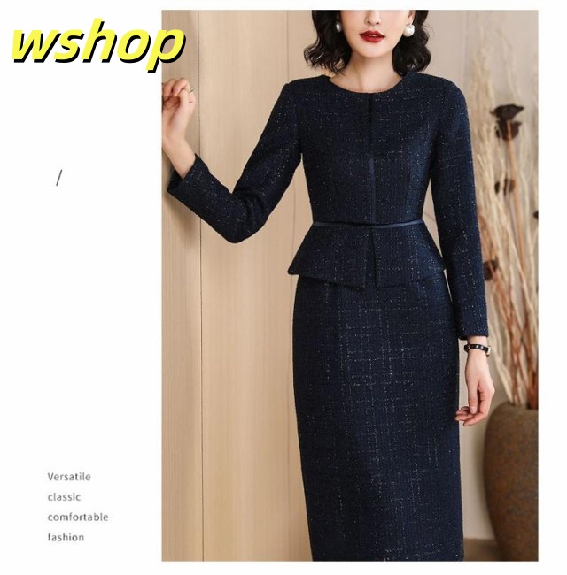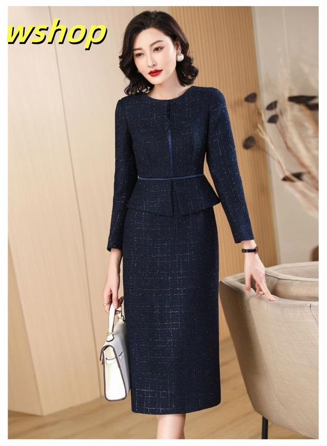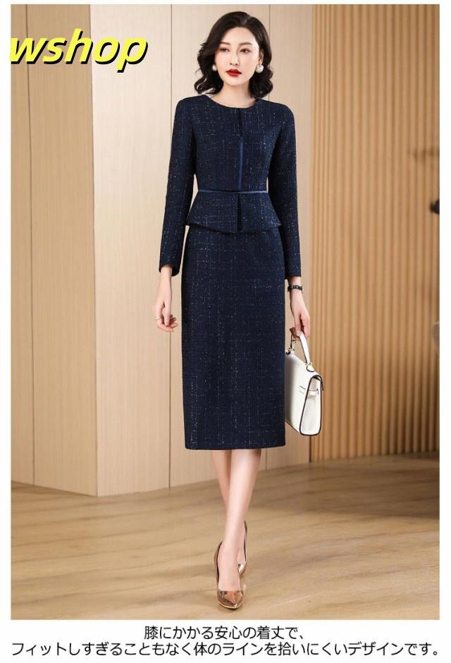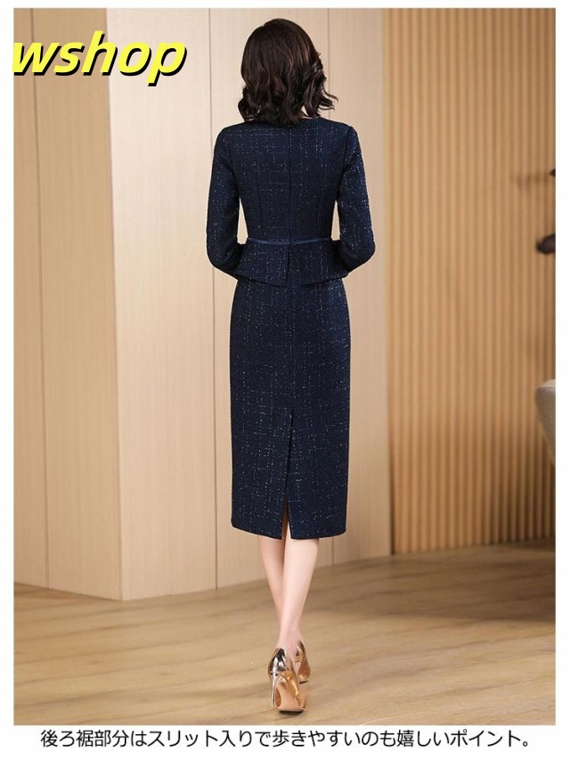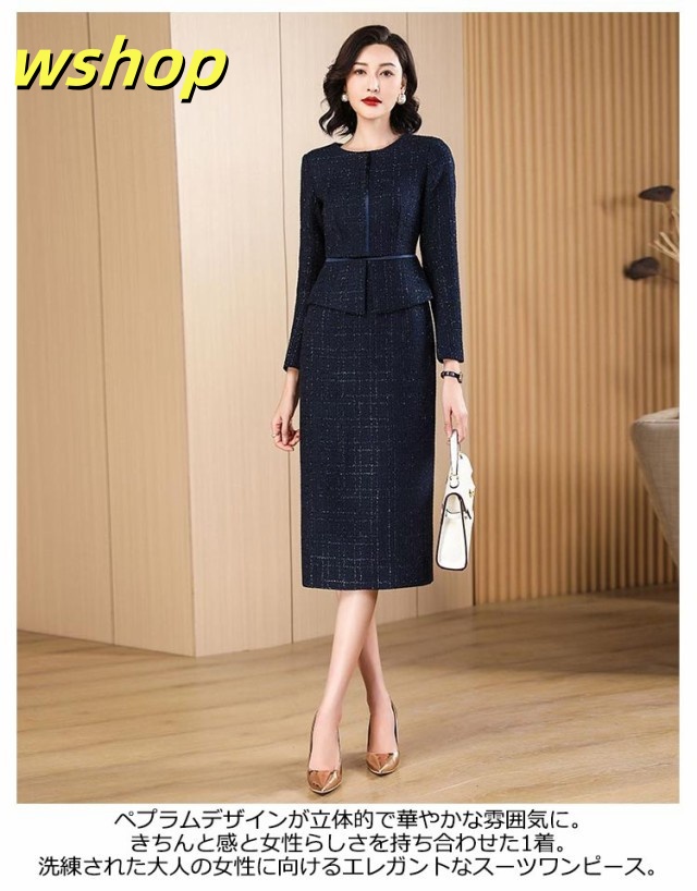 【wshop 】セレモニースーツ ワンピース ロング 長袖 ドッキング ワンピーススーツ レディース ママスーツ フォーマルスーツ 大きいサイズ 20代 30代 40代 50代 母 スーツ 卒業式 入学式 七五三 ツイード 膝下丈 タイトスカート ペプラムジャケット 春 夏 秋 【送無】