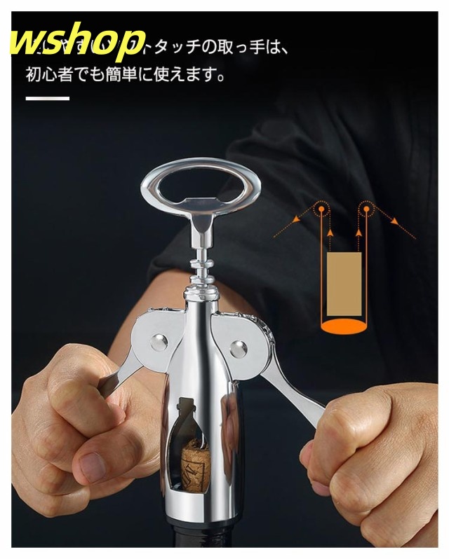 | 簡単にコルク抜ける!ワインオープナー。 新しい設計に変更されております。以前のコルク抜きより、コルクを損壊する可能性が低くなりました。 亜鉛合金属で出来ているため、丈夫で長く使えます。 使いやすいソフトタッチの取っ手は、初心者でも簡単に使えます。 ビルトインコルク抜きと強いワイングは、コルク抜きは力が無くても簡単に開けられて便利だ。 レストランやバーや自宅など場所を選ばず使用できます。 使い方:まず、スパイラルをコルクの中心に置き、レバーを回転させながらスパイラル部分をねじ込む。 次ぎ、ねじ込んでいくにつれて両側の羽のようなレバーが少しずつ上がってくる。 最後、上がったレバーをゆっくり下げると、てこの原理でコルクが抜ける。 | |