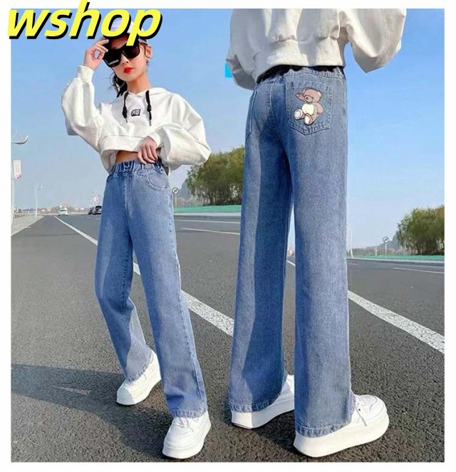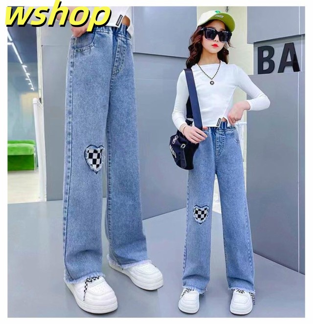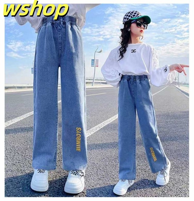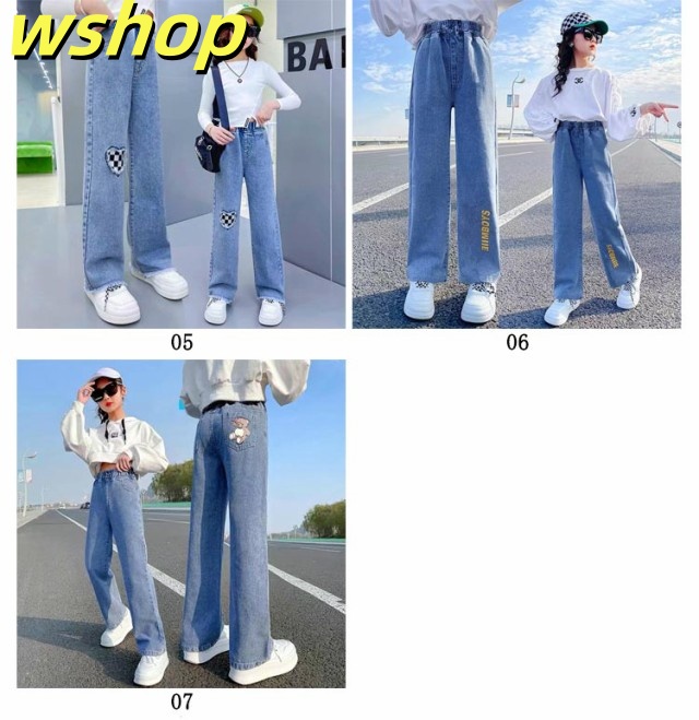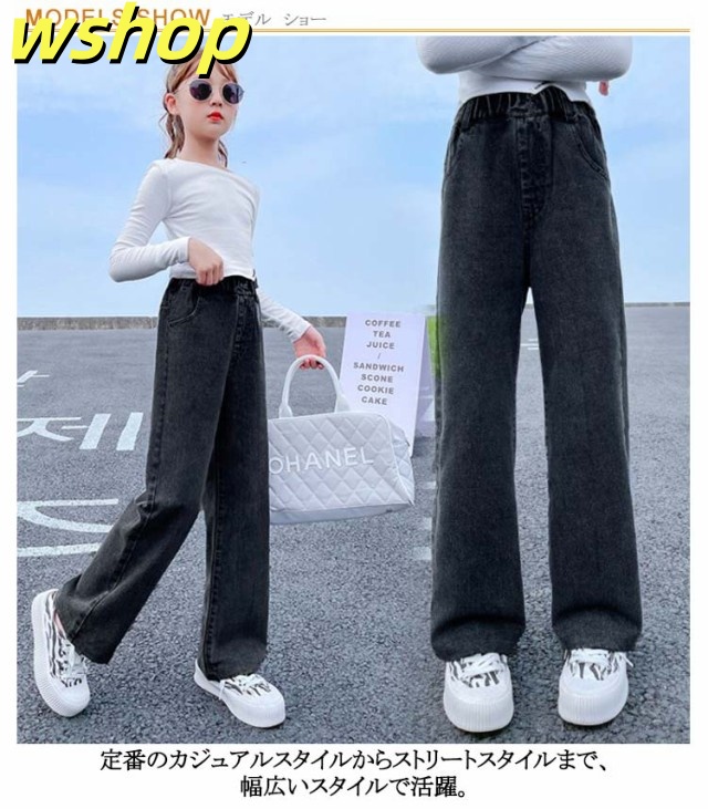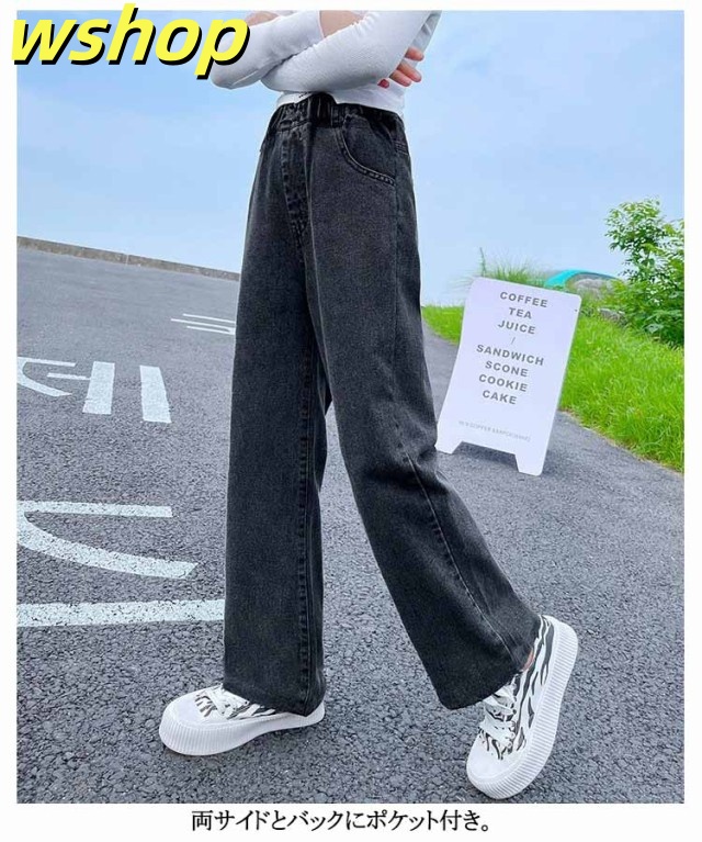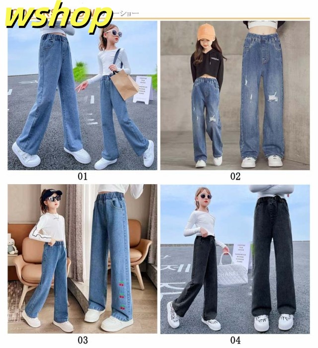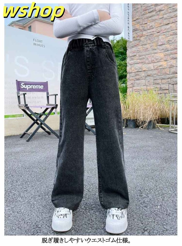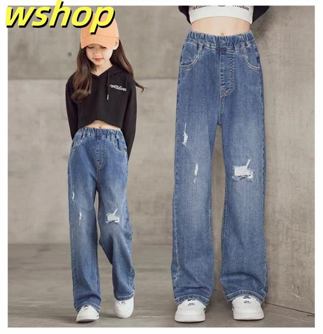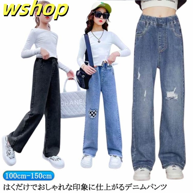 デニムパンツ 春 ジーンズ デニムパンツ パンツ キッズ ウエストゴム ジーパン ダメージ加工 女児 中学生 女の子 ボトムス ストレートパンツ ガールズ セミワイド 秋 小学生 ジュニア 春 長ズボン 100cm 110cm 120cm 130cm 140cm 150cm