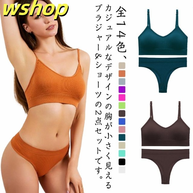 | 全14色、カジュアルなデザインの胸が小さく見えるブラジャー&ショーツの2点セットです。 お得な2ペア(4点)セット!(ブラジャー*2+ショーツ*2) 普段用のインナーとしてはもちろん、運動時にもおすすめです。 | |