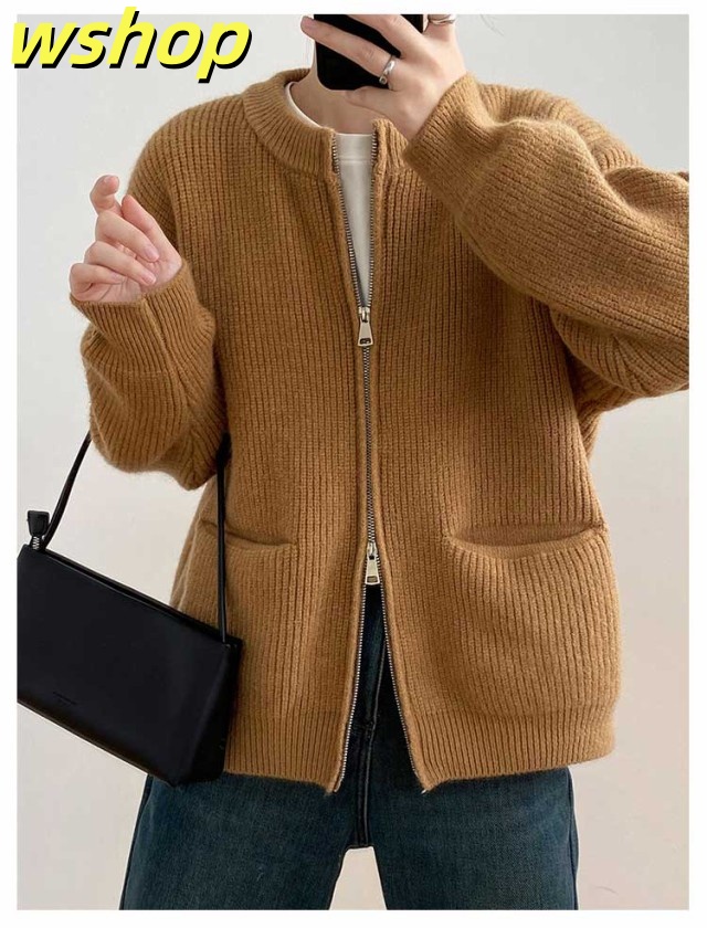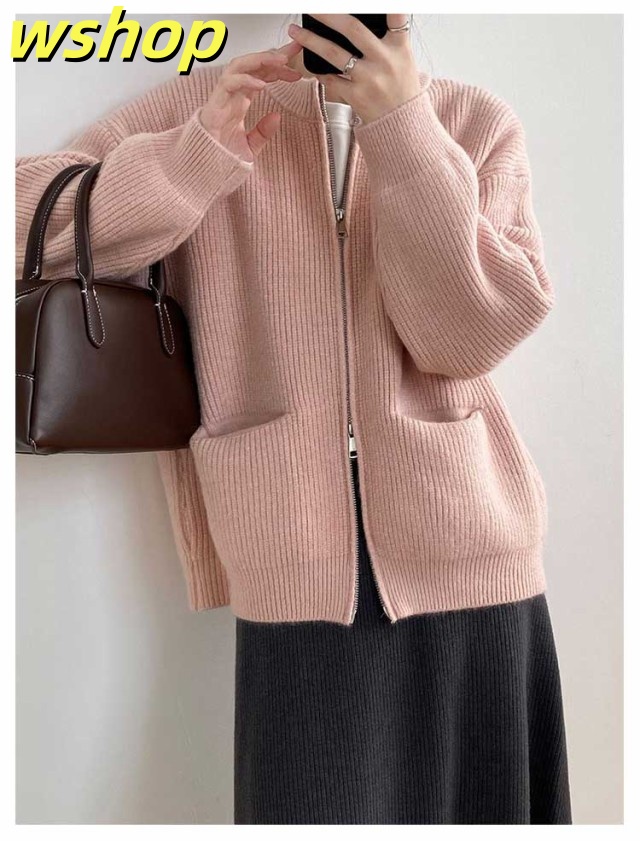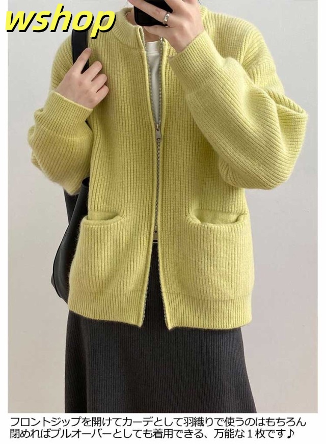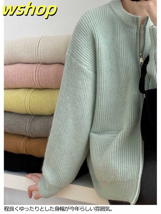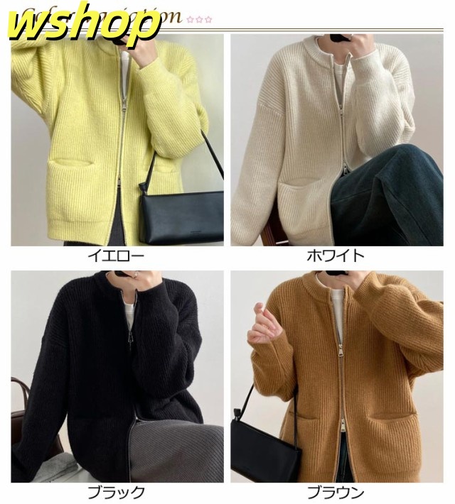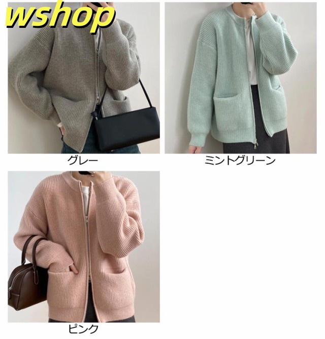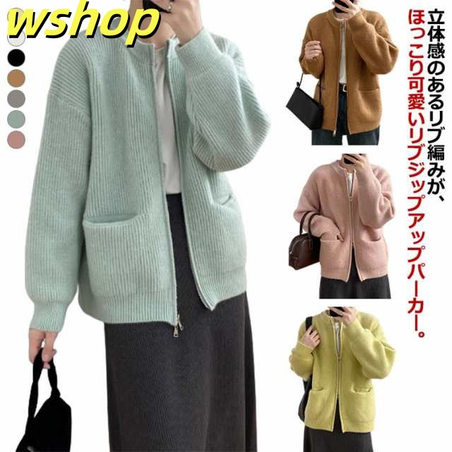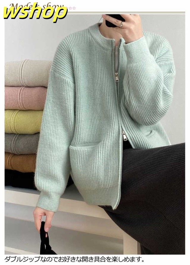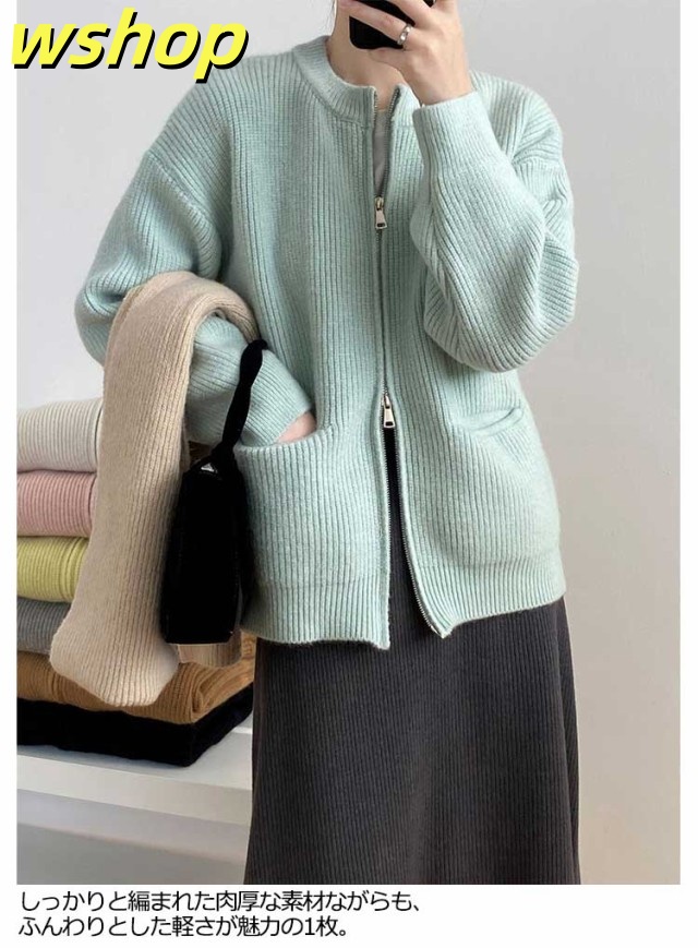 【wshop 】リブ 厚手 ダブルジップ 秋 保温 ニット クルーネック カーディガン 通学 ショート丈 ポケット付き ニットパーカー 羽織り ニットカーディガン 防寒 レディース アウター 秋服 秋物 あたっか 無地 シンプル 韓国風 大人 カジュアル 通勤 冬
