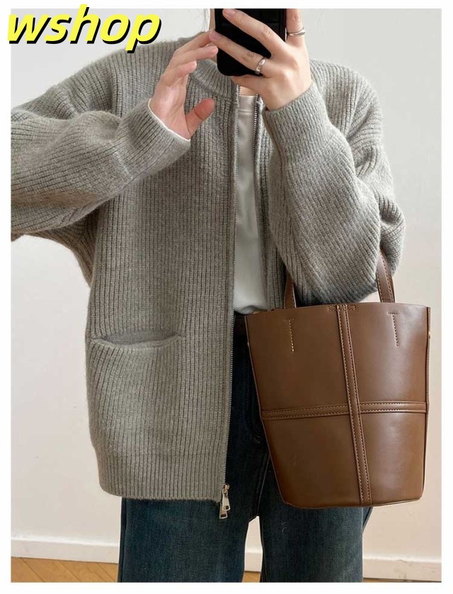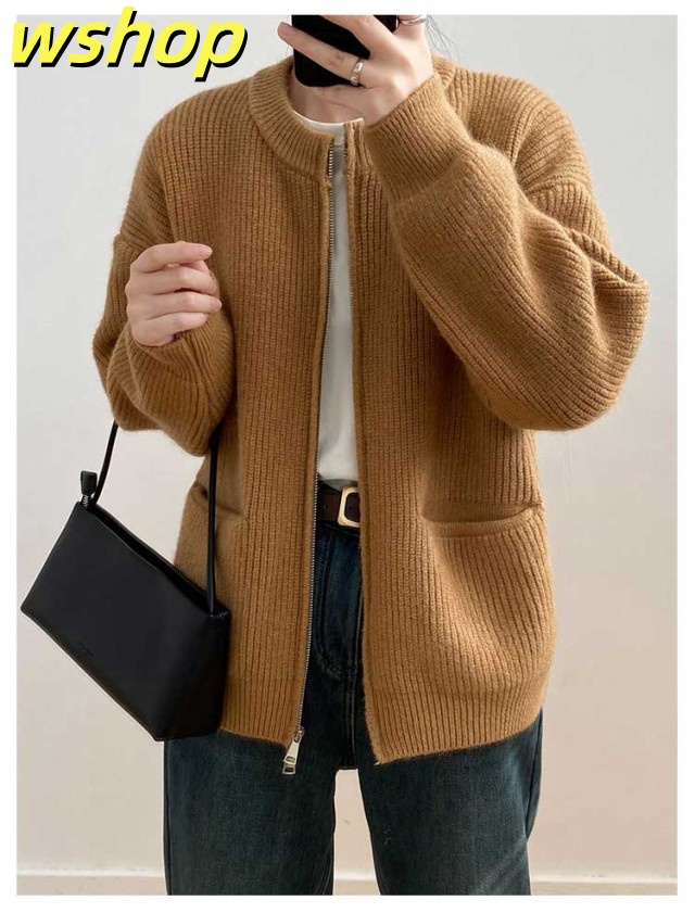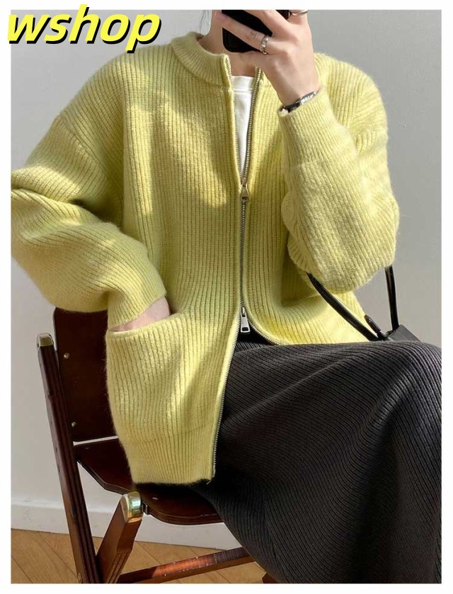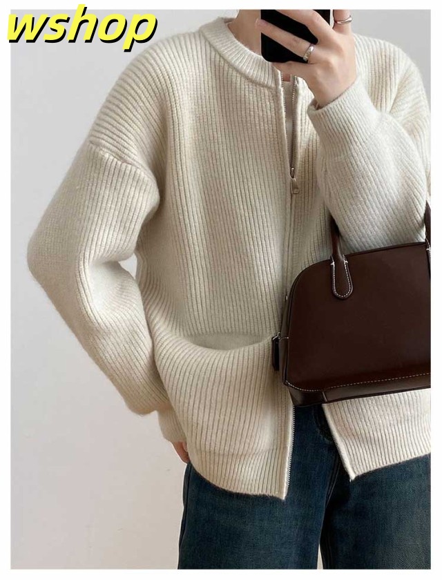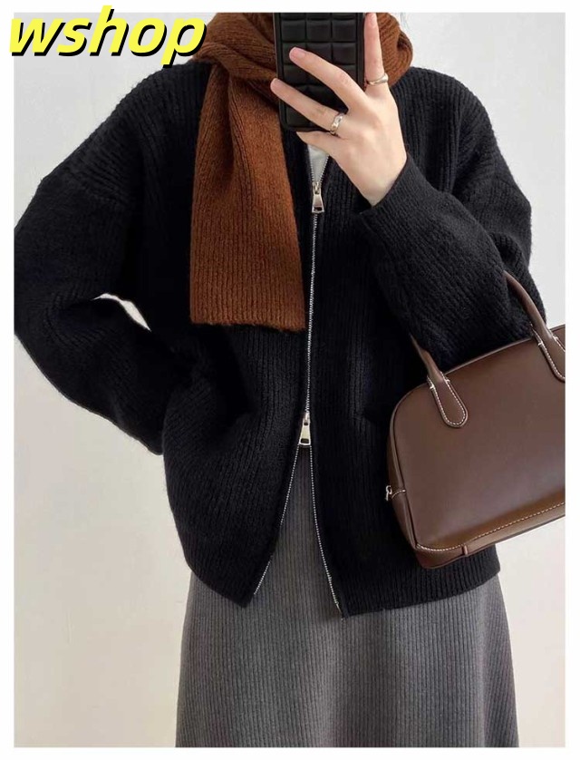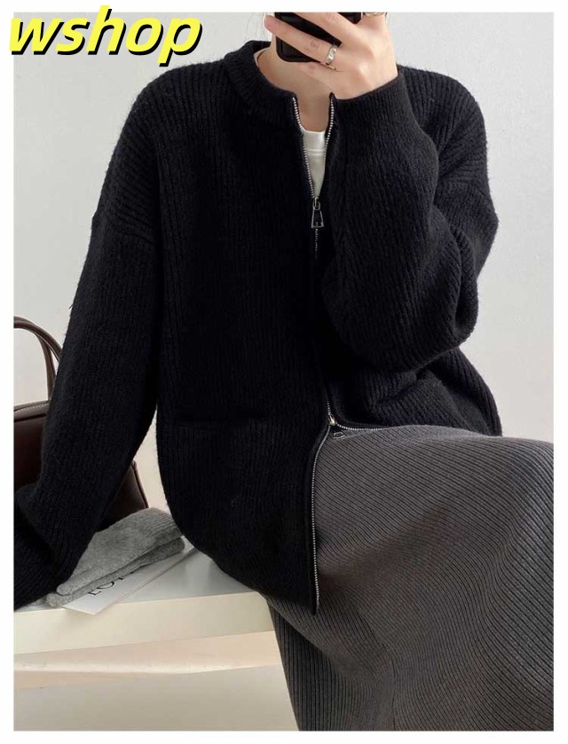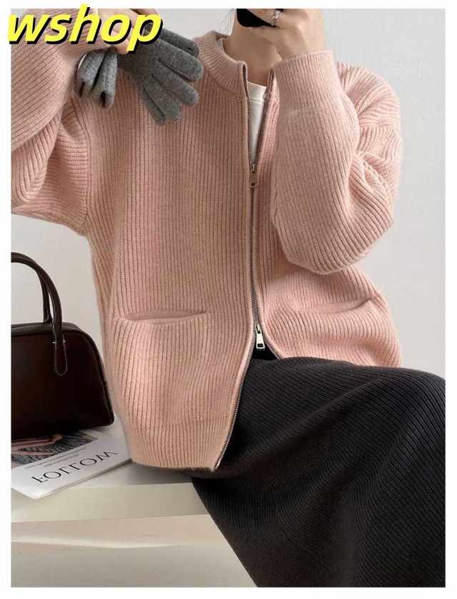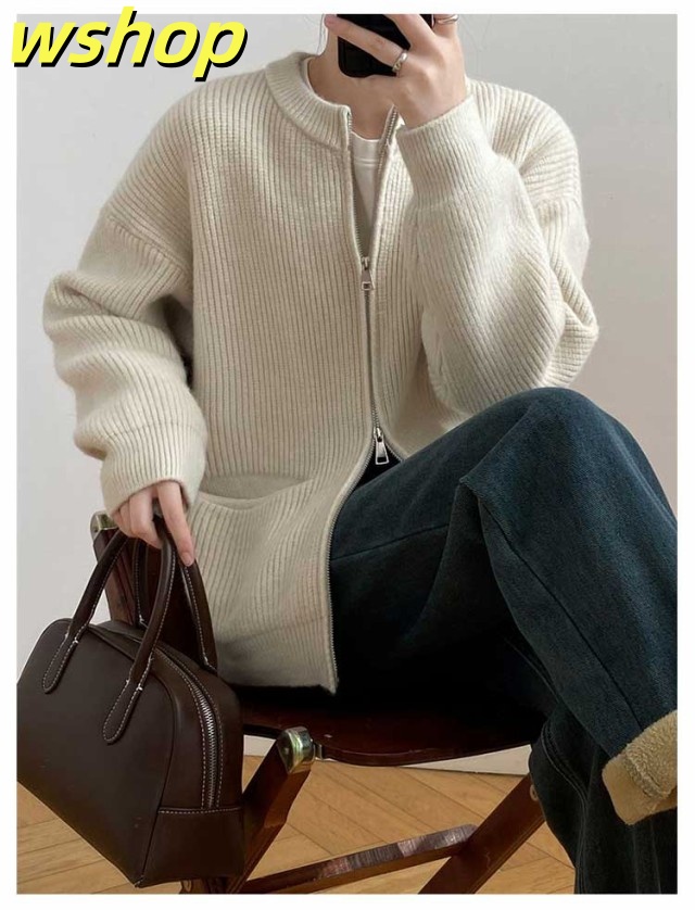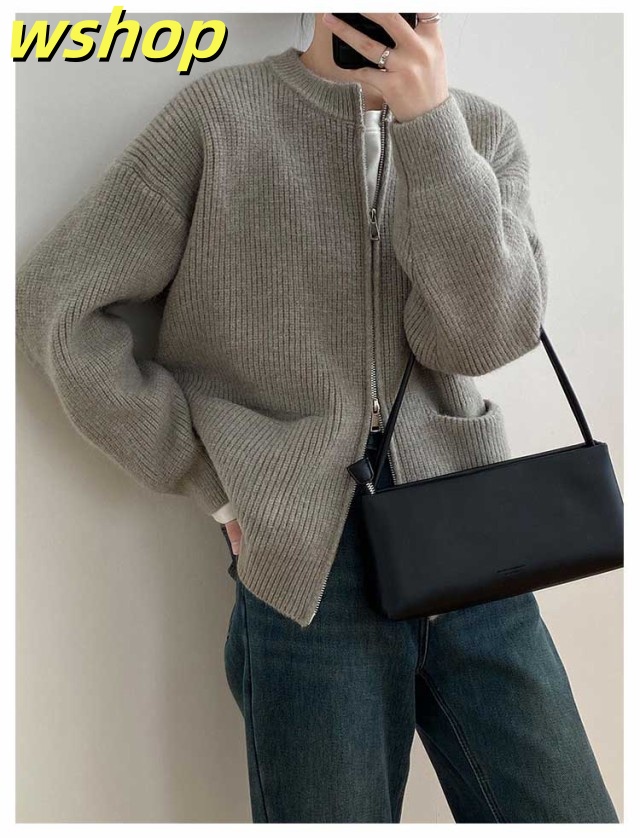 【wshop 】リブ 厚手 ダブルジップ 秋 保温 ニット クルーネック カーディガン 通学 ショート丈 ポケット付き ニットパーカー 羽織り ニットカーディガン 防寒 レディース アウター 秋服 秋物 あたっか 無地 シンプル 韓国風 大人 カジュアル 通勤 冬