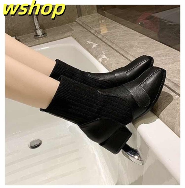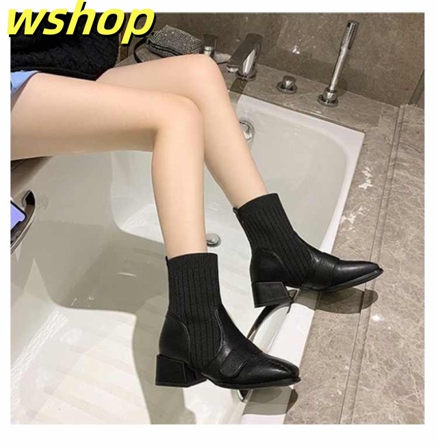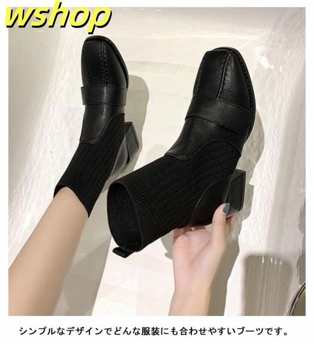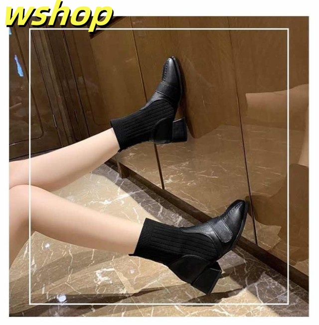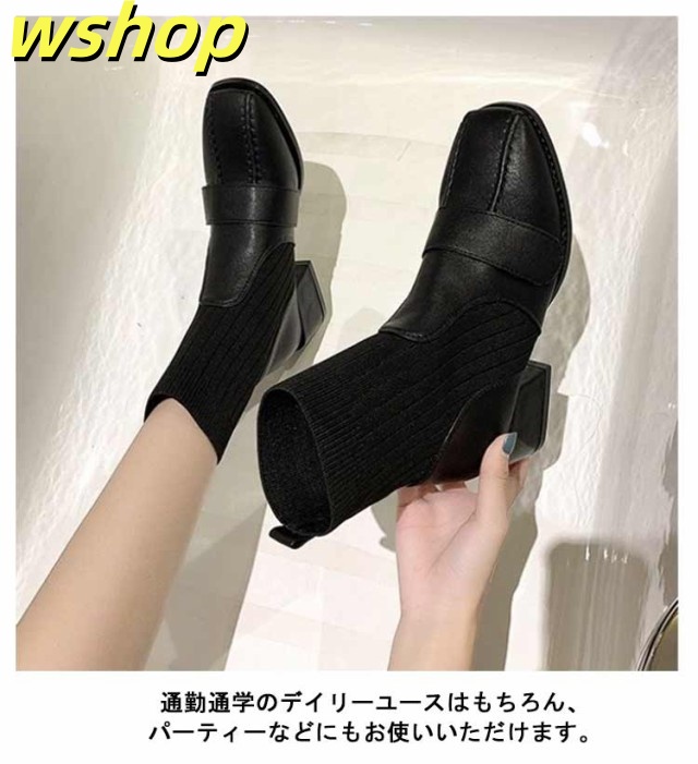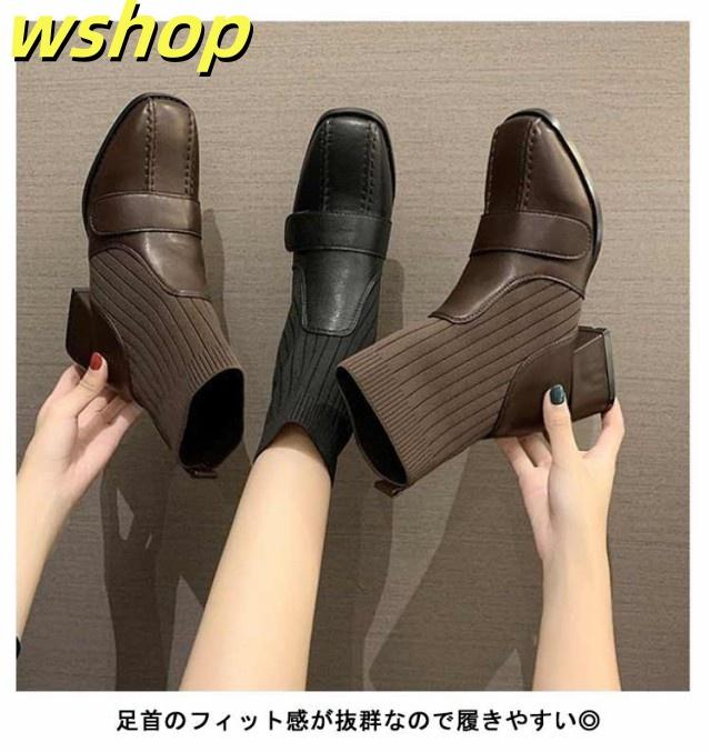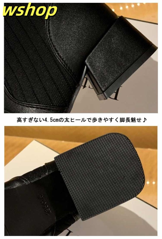 【wshop 】チャンキーヒール ブーツ レディース ショートブーツ ニットブーツ 4.5cmヒール 秋冬 歩きやすい 太ヒール ギフト ソックスブーツ 可愛い ショート丈 シューズ ストレッチブーツ 履きやすい 美脚 おしゃれ 疲れない 韓国ファッション 大人女性 リブニット